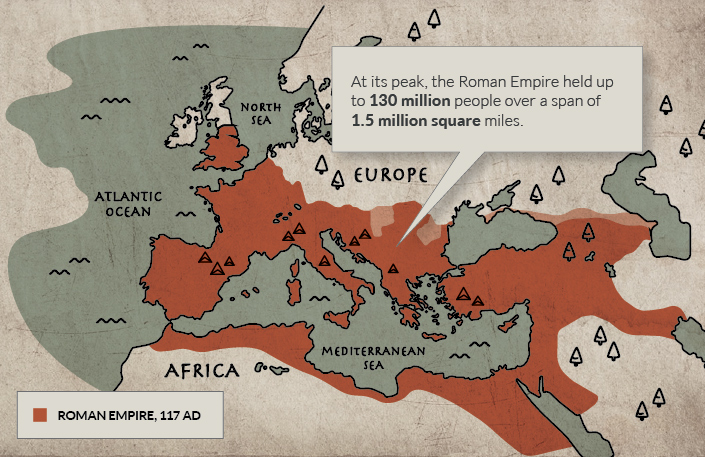 로마 제국의 정점은 이 생생한 유럽 지도에서 보이는 보다 극적인 순간 중 하나이다. 트라야누스 치하의 전성기에 로마 제국은 190만 평방 마일(500만 km²)에 달하는 거대한 규모였다. 이 거대한 제국은 동부와 서부 지역으로 돌이킬 수 없이 분할된 395년까지 대부분 온전하게 유지되었다.