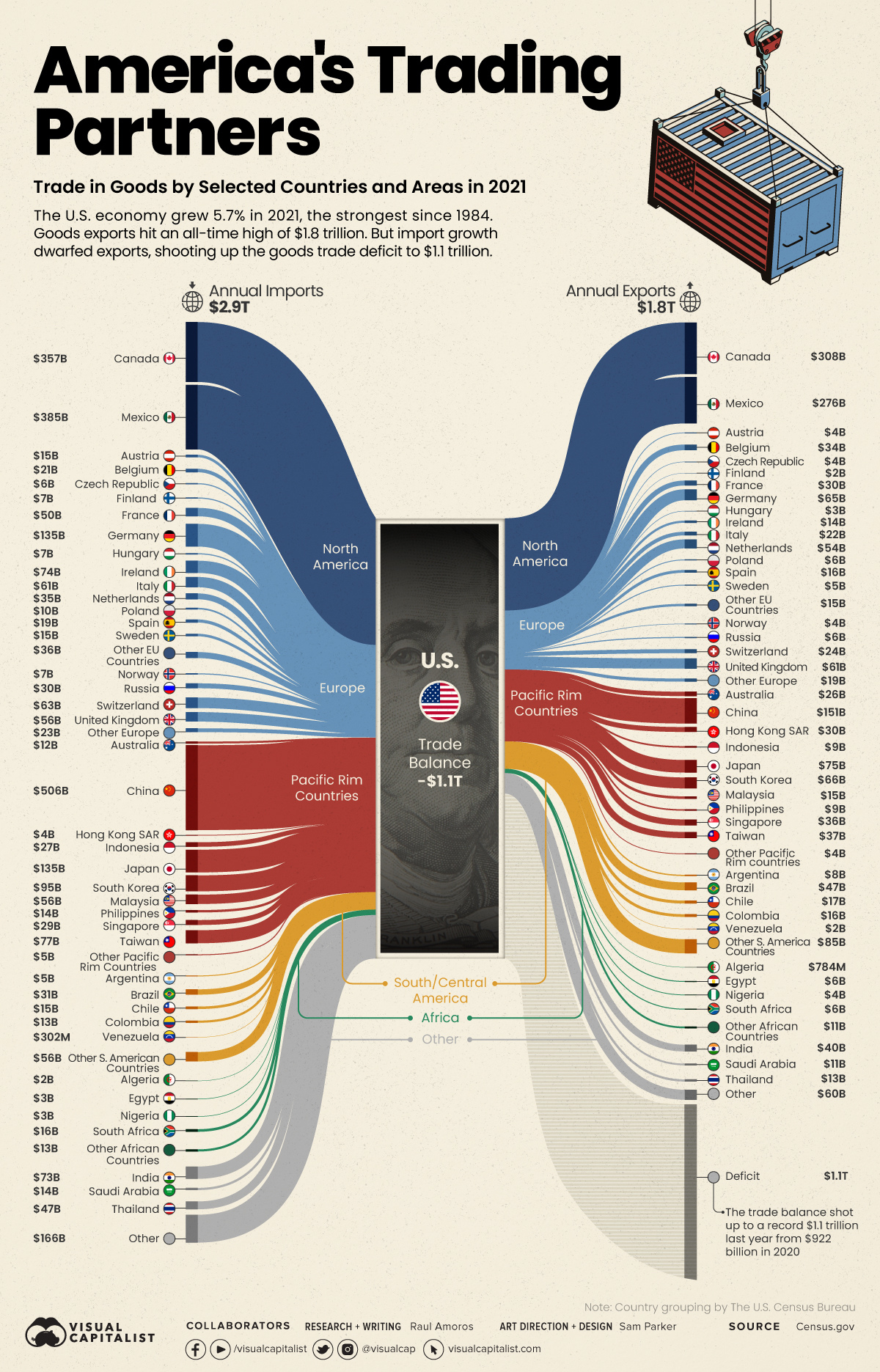 미국의 상품 무역적자는 2020년 9,220억 달러에서 2021년 1조 1000억 달러로 급증해 사상 최대 적자로 이어졌다. 수입은 수출을 왜소하게 만들 정도로 2021년 2조 9000억 달러의 최고치를 경신했고 타국에 대한 미국의 수출은 1조 8000억 달러에 달했다.