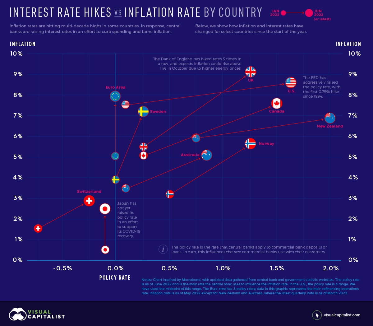 일부 국가에서 인플레이션율이 수십 년 만에 최고치를 기록하면서, 많은 중앙은행이 금리 인상을 발표했다. 아래는 2022년 1월 이후 선별된 국가 및 지역의 인플레이션율과 정책금리가 어떻게 달라졌는지를 보여준다. 관할 구역은 현재 인플레이션율이 가장 높은 곳에서 가장 낮은 순으로 정렬된다.