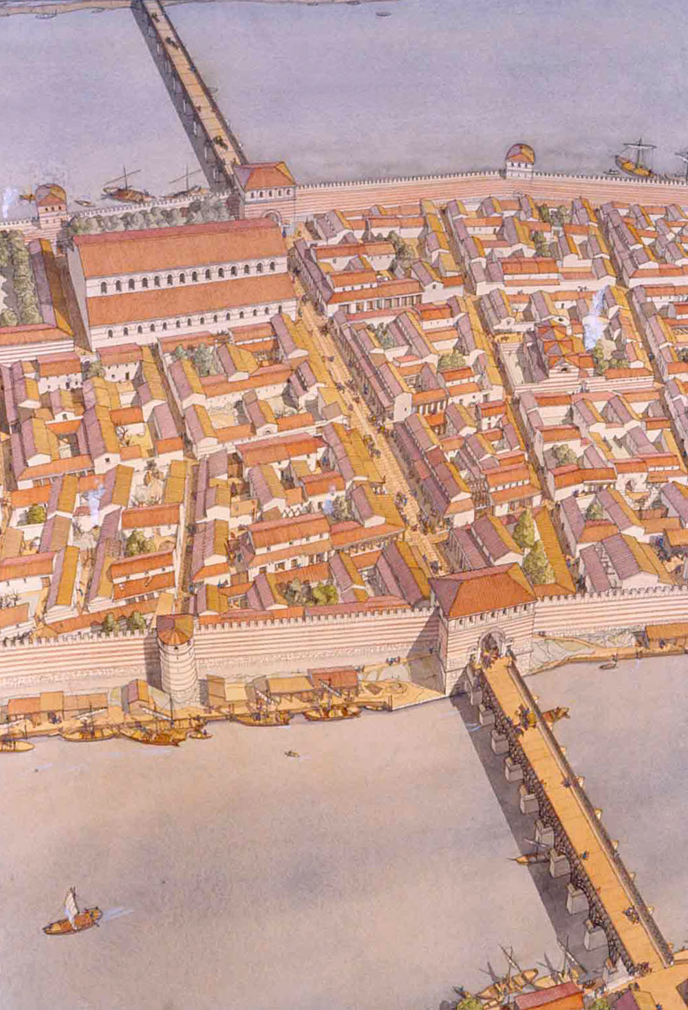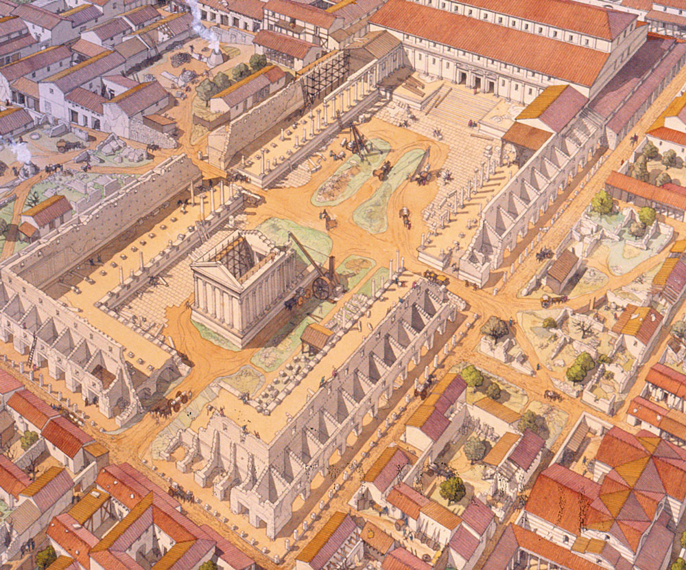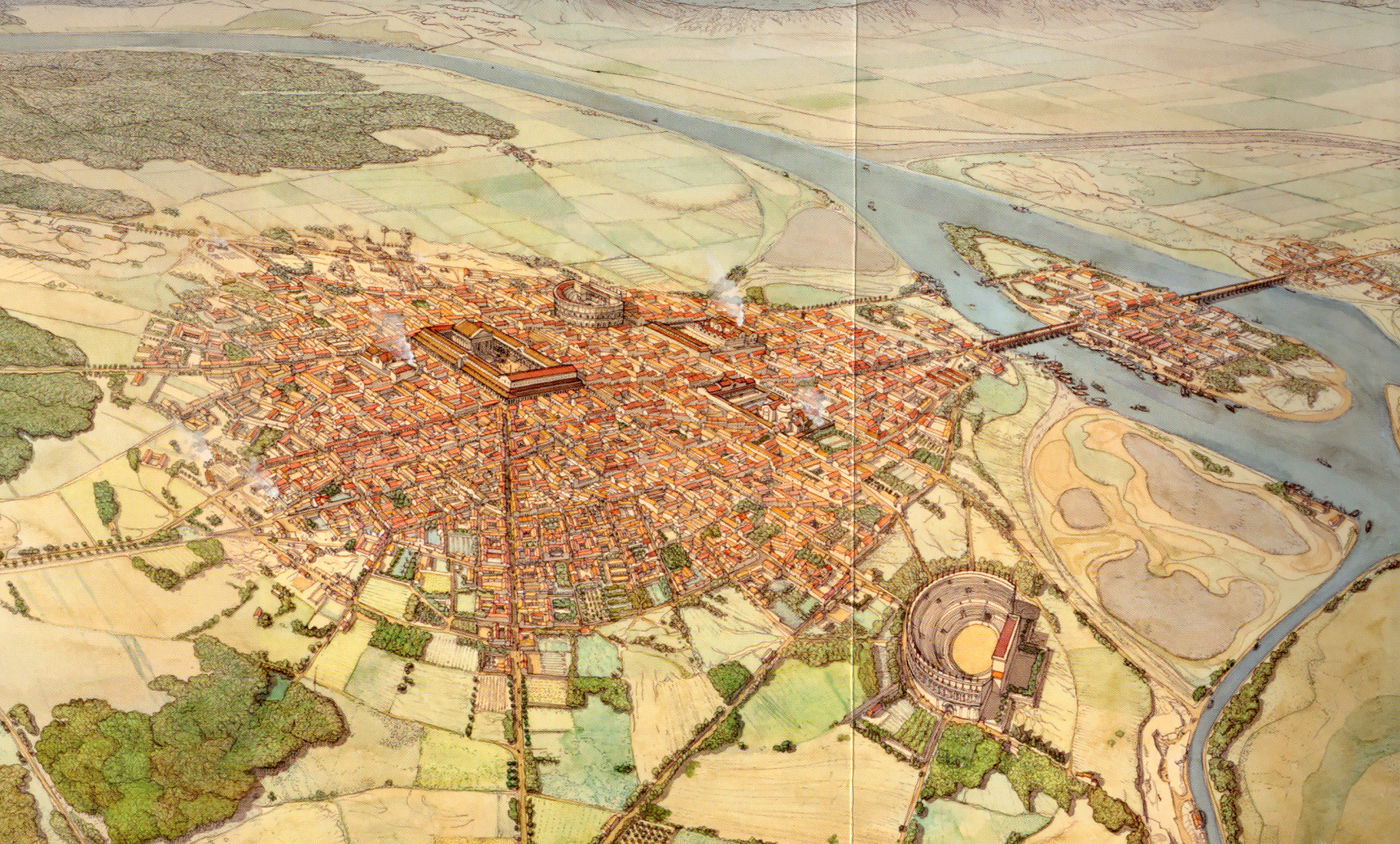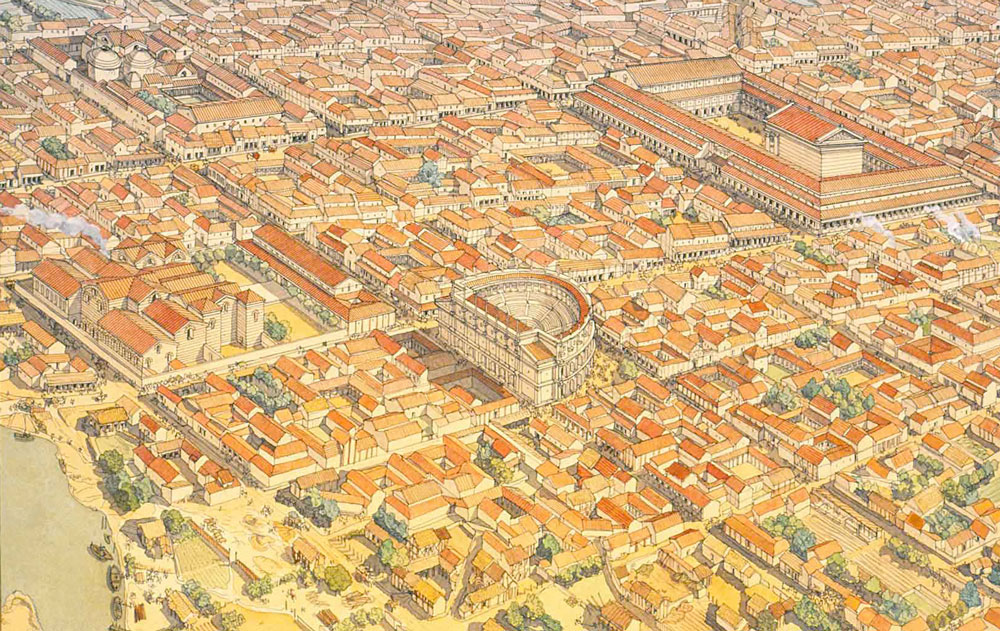 거리 계획과 주요 기념물의 경계(언덕 꼭대기에 있는 포럼, 극장, 목욕탕)는 로마 도시가 300 로마 피트의 블록 또는 격리하여 배치되었음을 보여준다.