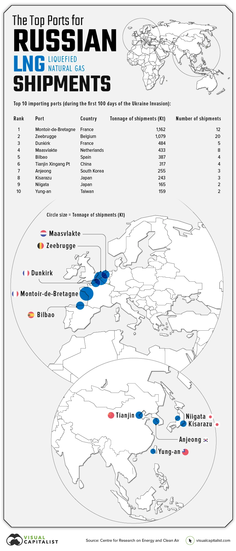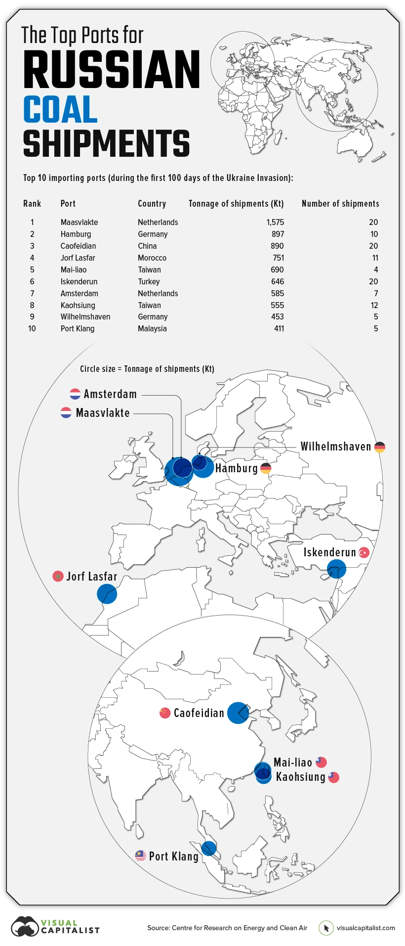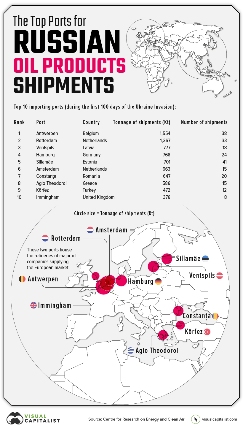화석연료의 대부분은 파이프라인을 통해 유럽을 통과하지만, 여전히 항구 사이를 이동하는 많은 해상 운송이 있다. 아래 지도는 에너지 및 청정 공기 연구 센터(CREA)가 집계한 MarineTraffic.com과 Datalastic의 데이터를 사용하여 침공 초기 100일 동안의 러시아의 화석연료 선적량을 나타낸 것이다.
