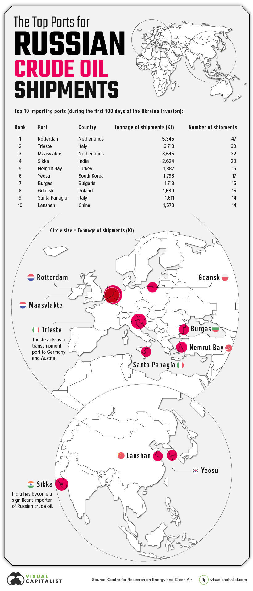 러시아산 원유 해상 선적의 상당 부분은 네덜란드와 이탈리아로 갔지만, 원유는 인도와 한국까지 멀리 운송되기도 했다.