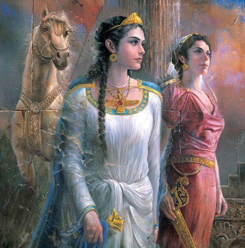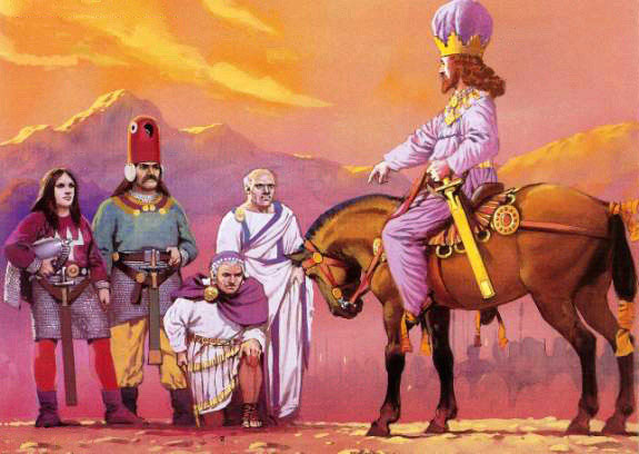 아래의 고대 그림은 로마 황제 발레리아누스와 원로원 의원이 페르시아의 샤푸르 왕(말을 타고 있는)에게 항복하는 모습을 보여주고 있다. 발레리아누스 황제가 무릎을 꿇고 페르시아의 샤푸르 왕에게 자비를 구하고 있는 가운데 페르시아의 여성 기병 장교(왼쪽)가 수렌 일족의 귀족(높이 솟은 모자를 쓰고 있는)과 함께 지키고 있다. 로마는 노예제도와 전쟁 포로 및 피를 기반으로 한 경제를 가진 잔인한 제국이었고 그들의 주된 목표는 페르시아를 정복하는 것이었지만 양측을 약화시키고 많은 생명을 앗아간 끝없이 잔혹하고 불필요한 많은 전쟁에도 불구하고 성공하지 못했다.