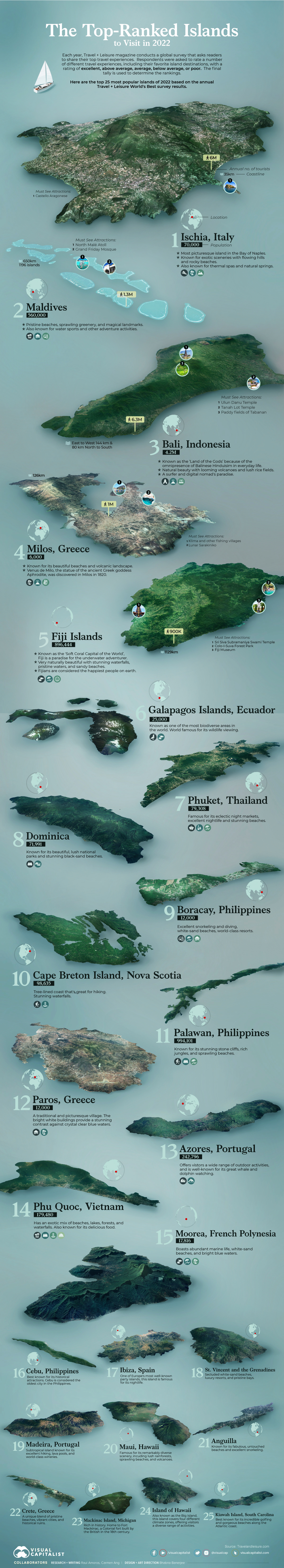 이 그래픽은 여행 + 레저(T+L) 매거진의 설문조사 데이터를 사용하여 전 세계에서 방문해야 할 상위 25개 섬을 강조했다.
