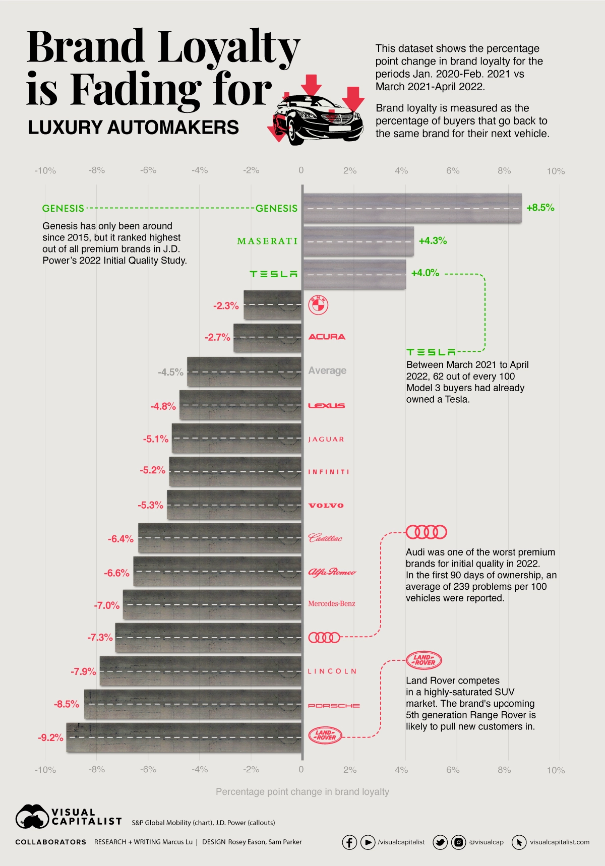 폭스바겐 그룹의 두 브랜드인 아우디와 포르쉐 역시 충성도 측면에서 저조했다. 두 브랜드 모두 가솔린 및 전기차 제품군을 제공하기 때문에 이는 다소 놀랍다. 아큐라, 렉서스, 마세라티와 같은 많은 경쟁자들은 아직 EV를 출시하지 않았다.