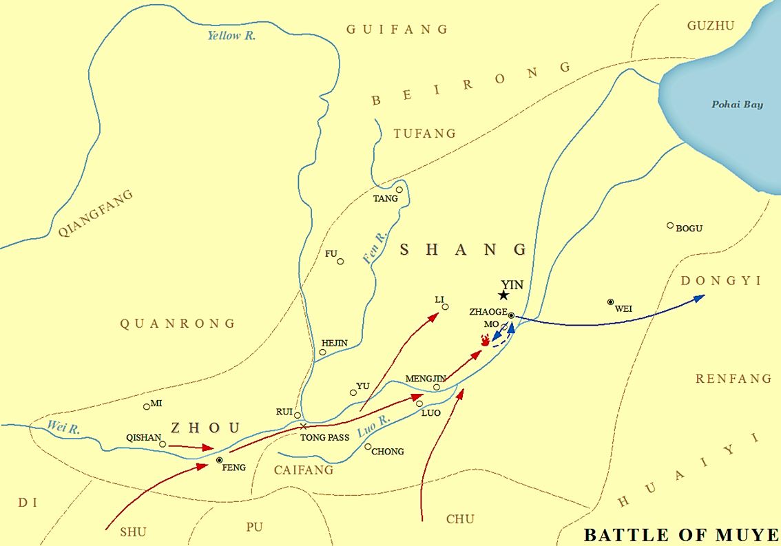 BC 1046년 목야 전투(牧野戰鬪) - 주 무왕(武王)이 이끄는 주나라 군대가 상나라 탈주자들의 도움을 받아 은허 인근의 목야에서 상의 군대에 피비린내 나는 패배를 안기다