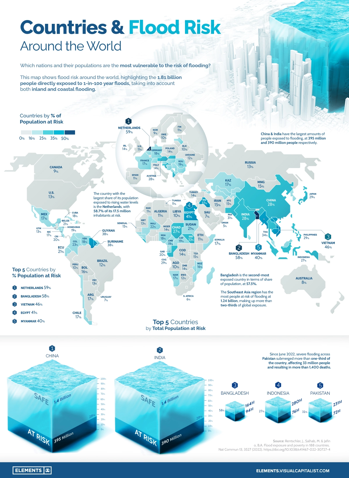 인구의 절반 이상이 홍수로 위험에 처한 나라는 네덜란드와 방글라데시가 각각 59%와 58%로 세계에서 유이한 국가이다. 베트남(46%), 이집트(41%), 미얀마(40%)가 나머지 상위 5개국을 차지했다.