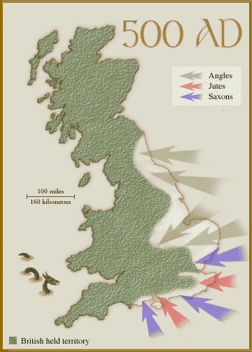500년대의 한 전설은 침입한 앵글로색슨족에 맞서 일련의 승리를 거둔 로마화 된 켈트족인 아서(Arthur)라는 이름의 왕에 관한 이야기이다. 아서 왕의 전설은 중세 시대에 성장했지만, 그의 몇 번의 승리는 침략자들을 막기에는 충분하지 않았다. 아서 이후, 브리튼인은 스코틀랜드 출신 픽트족의 침입으로부터 자신들을 방어하기 위해 유트족 출신의 용병 헹기스트와 호르사를 고용했다. 픽트족과 싸우는 대신, 이 유트족은 브리튼인에게서 땅을 빼앗고 켄트라고 불리는 그들만의 왕국을 세웠다.