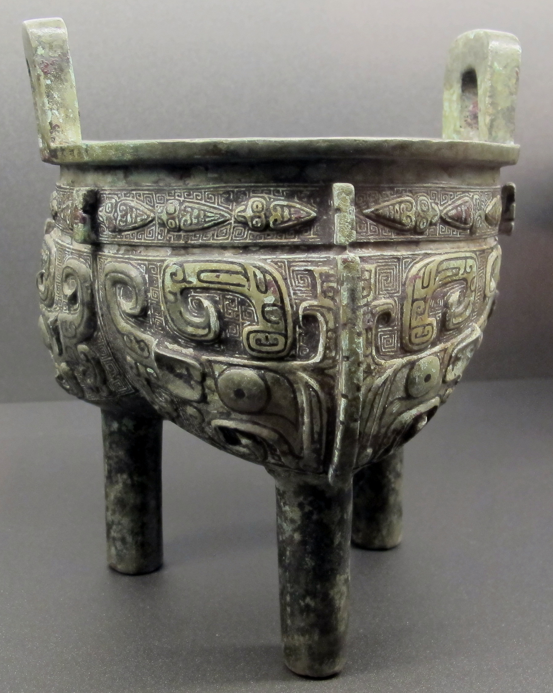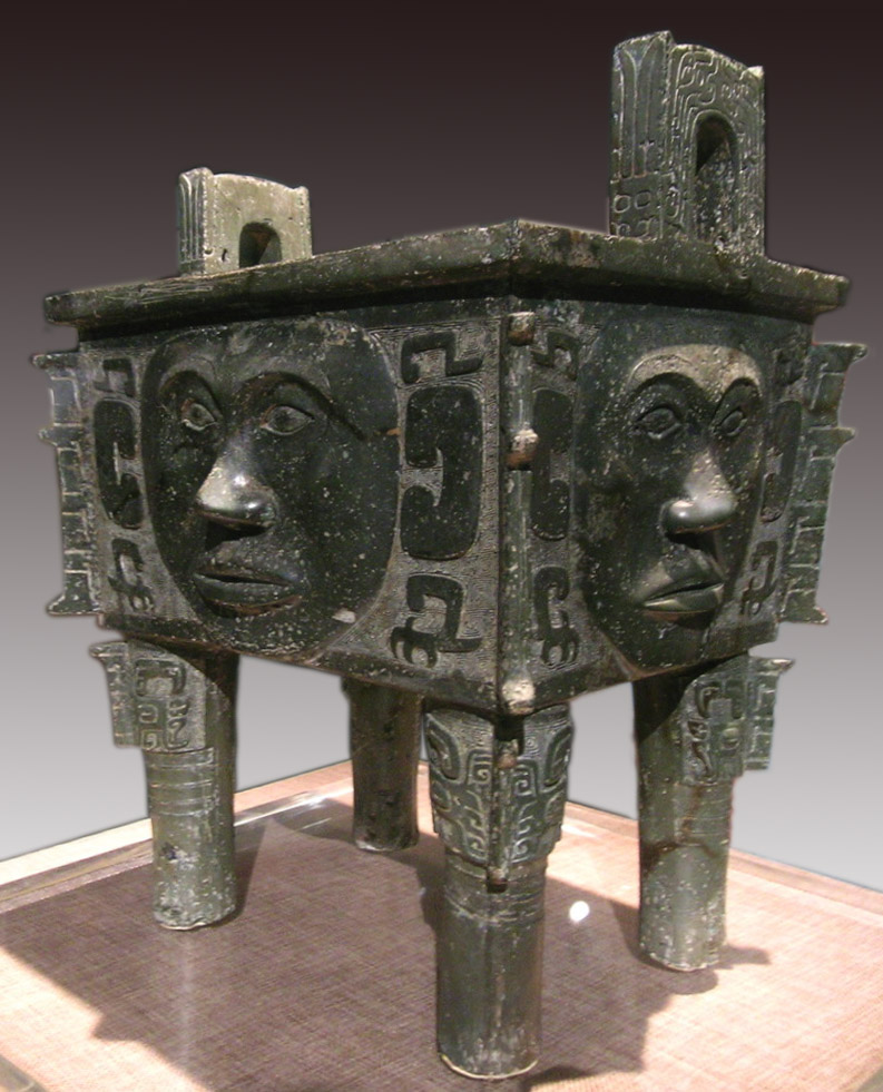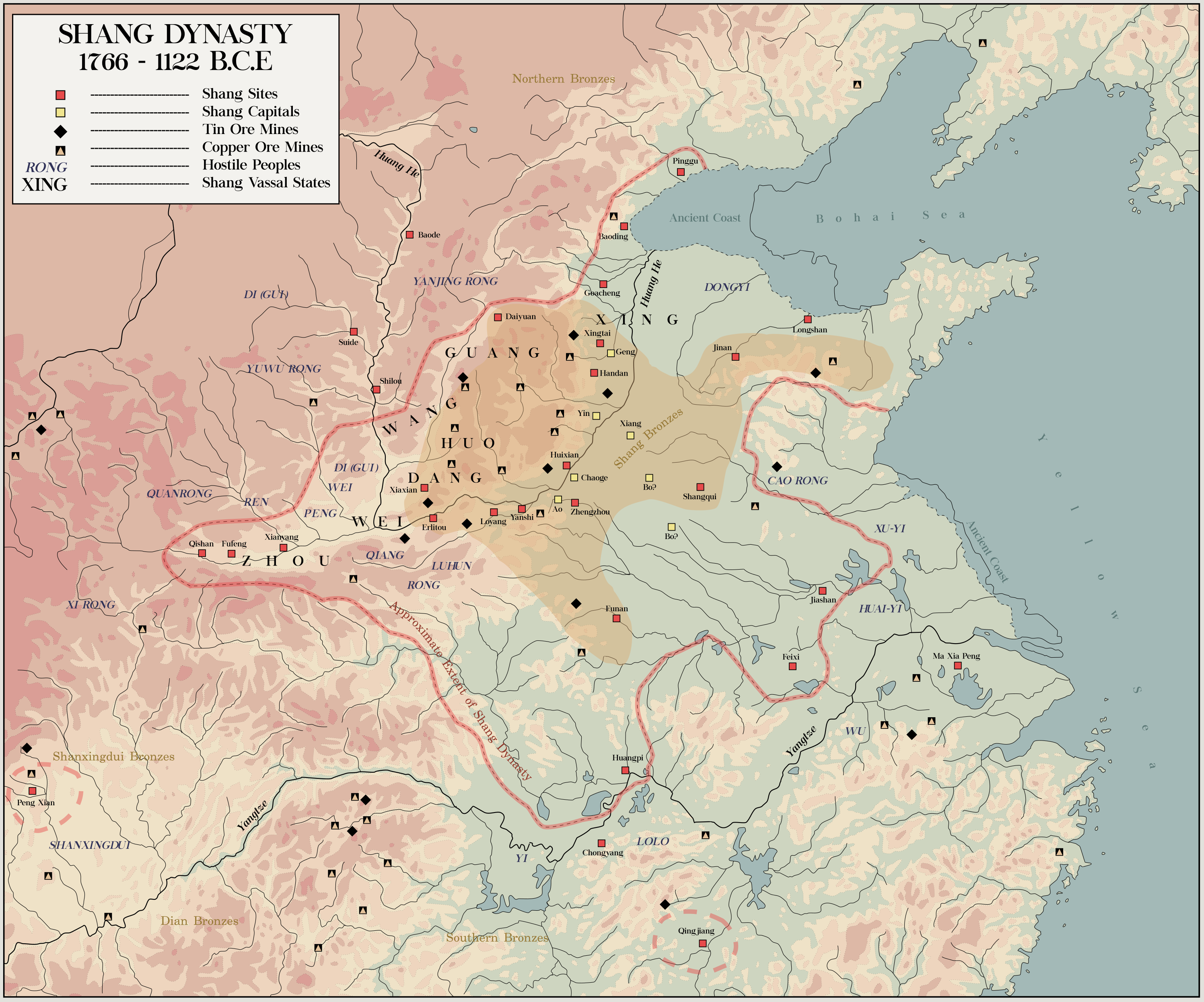 중국의 청동 주물과 도자기는 상 왕조 시대에 발전했으며 청동은 주로 실용적이라기보다는 의식적으로 중요한 품목에 사용되었다. BC 1500년 경 상 왕조 초기에는 청동기 선박과 무기의 대규모 생산에 종사했다. 이 생산에는 필요한 구리, 주석, 납 광석의 채광, 정제 및 운송을 처리할 수 있는 대규모 노동력이 필요했다. 이로 인해 열심히 일하는 사람과 숙련된 장인 및 장인 모두를 감독할 수 있는 공식 관리자가 필요하게 되었다. 상 왕실과 귀족들은 다양한 의식 목적과 종교적 점술 행사를 위해 다양한 청동 그릇을 필요로 했다. 의식 규칙은 특정 계급의 귀족이나 귀족이 소유할 수 있는 각 유형의 청동 상자 수를 규정하기도 했다. 사용 가능한 청동의 양이 늘어남에 따라 군대는 다양한 청동 무기를 더 잘 장비할 수 있었다. 청동은 또한 BC 1200년 경 중국에서 나타난 바퀴가 달린 전차의 부속품에도 사용되었다.