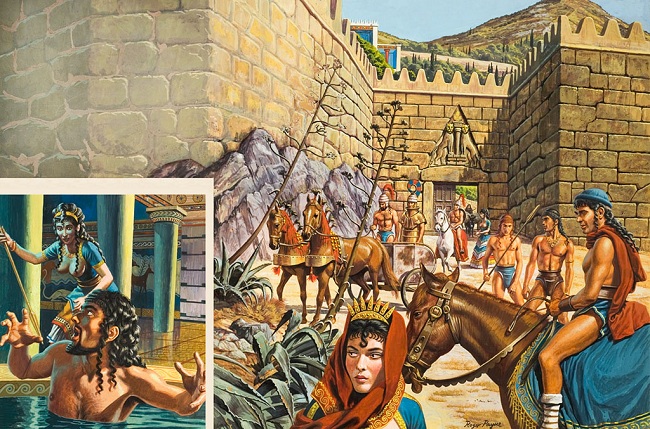 일리아스는 소아시아의 트로이 성채를 공격한 아카이아인(그리스인)에 대해 이야기한다. 미케나이인이 이들 그리스인이었을 가능성이 매우 높다. 이야기는 미케나이 도시국가인 스파르타의 왕비 헬레네가 트로이 왕자 파리스에게 납치되어 트로이로 데려오는 것을 언급한다. 그리스 도시 국가들은 헬레네를 고국으로 데려오기 위해 대규모 함대를 보내 트로이를 공격했다. 요새인 트로이는 공격하기가 매우 어려웠고, 전쟁은 10년 동안 지속되었다. 마침내 그리스인이자 이타카의 왕인 오디세우스가 아카이아인이 패배하여 출항하는 척하며 커다란 목마를 남겨두는 속임수를 고안했다. 트로이군은 그 목마가 패배한 그리스인의 선물이라고 생각하고 목마를 도시로 옮겼다. 축하 행사가 끝난 후, 목마 속에 숨은 오디세우스와 다른 그리스인들은 아카이아군이 들어올 수 있도록 문을 열었다. 아카이아인은 트로이 도시를 파괴했고 헬레네는 스파르타로 돌아왔다.
