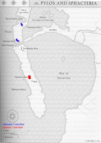 BC 428년 아테네인은 오래된 도시 필로스를 점령함으로써 펠로폰네소스 반도에 거점을 확보했다. 스파르타인이 도시를 되찾으려 했을 때, 400명의 스파르타 호플리테스는 근처의 스팍티리아 섬에 갇히게 되었다. 아테네인은 스파르타인을 굶주리게 하여 결국 항복하게 했고 120명의 스파르타 호플리테스를 아테네로 데려왔다. 그들은 이 스파르타 호플리테스를 인간 동물원에 전시했는데, 아테네인은 스파르타 호플리테스를 가까이에서 본 적이 없었기 때문이다. 스파르타는 이 전사들이 돌아오기를 간절히 원했고, 아테네와 타협할 의사가 있었다.