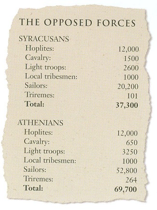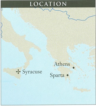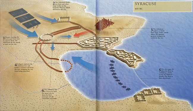 아테네에서 서쪽으로 800 마일 떨어진 시칠리아섬에서 벌어진 시라쿠사 전투. 1) 그들을 맞기 위해 파견된 시라쿠사군을 물리쳤음에도 아테네 침공군은 도시를 향해 나아가지 못한다. 2) 아테네군은 시라쿠사 도시가 내려다보이는 두 개의 요새를 건설한다. 3) 아테네군은 포위망 구축에 실패하여 스파르타 길리포스의 시칠리아 상륙을 허용했다. 4) 길리포스는 라브달론 "스퀘어 요새"를 점령하고, 도시를 포위하는 것을 막기 위해 대항 벽을 쌓았다. 5) 시라쿠사인은 항구를 가로질러 쇠사슬을 달아 아테네 함대를 함정에 빠뜨린다. 6) 아테네군은 육로로 탈출하려다가 베어지고 포로가 된다.