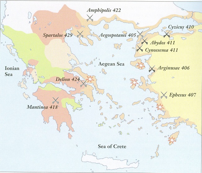 펠로폰네소스 전쟁은 아테네와 스파르타 사이의 일련의 분쟁이었다. 아테네와 스파르타 모두 동맹 또는 연합을 맺어 동맹국들을 전쟁에 끌어들였기 때문에, 이들 전쟁은 그리스 세계의 대부분을 포함했다. 아테네의 투키디데스는 아테네 편에서 싸운 전쟁의 주요 출처이다. 투키디데스는 아테네 지휘관 중 하나였던 BC 422년 암피폴리스 전투에서 스파르타가 결정적인 승리를 거둔 후 배척되었다. 투키디데스는 펠로폰네소스 전쟁사라는 책을 썼다. BC 431년에서 404년까지 갈등은 "대전"으로 알려진 것으로 확대되었다. 그리스인에게 "대전"은 그리스 세계의 많은 지역뿐만 아니라 마케도니아인, 페르시아인, 시칠리아인도 포함하는 세계대전이었다.