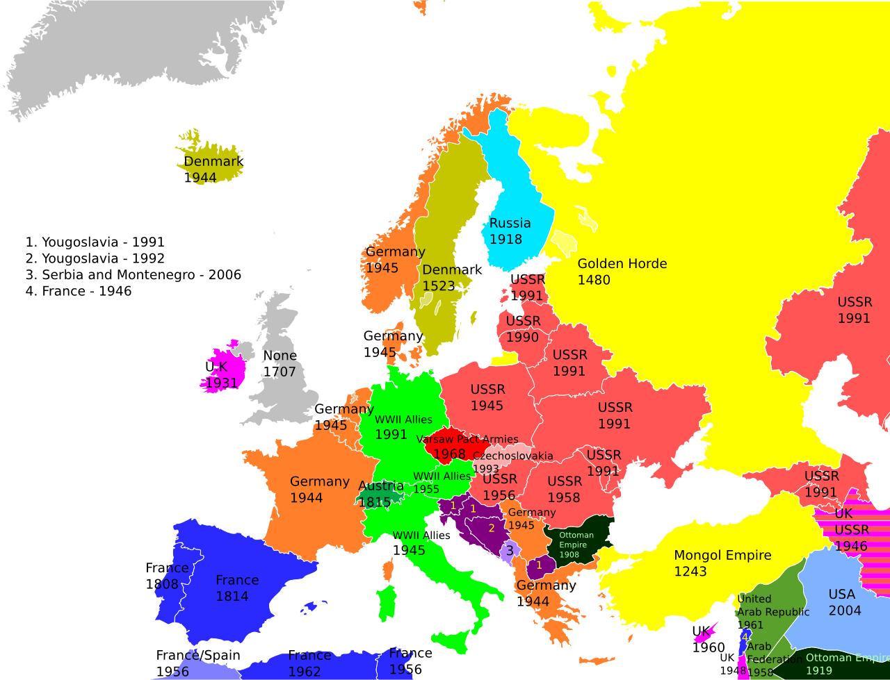 아래 지도는 각 유럽 국가가 다른 나라의 일부였던 마지막 시간을 보여준다.