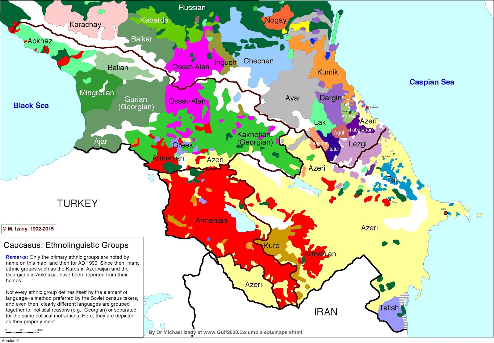 이 지도에는 주요 민족만 이름으로 표시되어 있으며, 1990년도이다. 그 이후로, 아제르바이잔의 쿠르드족과 압하지야의 조지아인과 같은 많은 민족 집단이 그들의 고향에서 추방되었다.