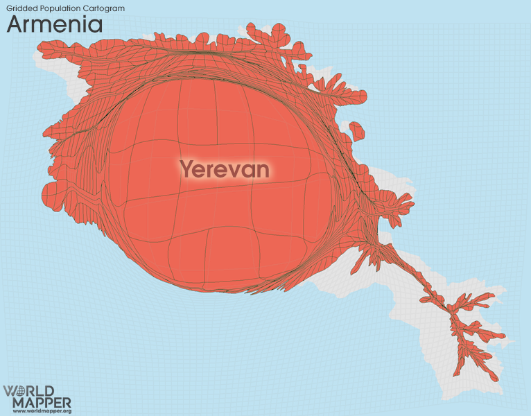 그렇다면 이들 인구는 지역 전체에 어떻게 집중되어 있을까? 국가별로 분류한 World Mapper의 지도이다.