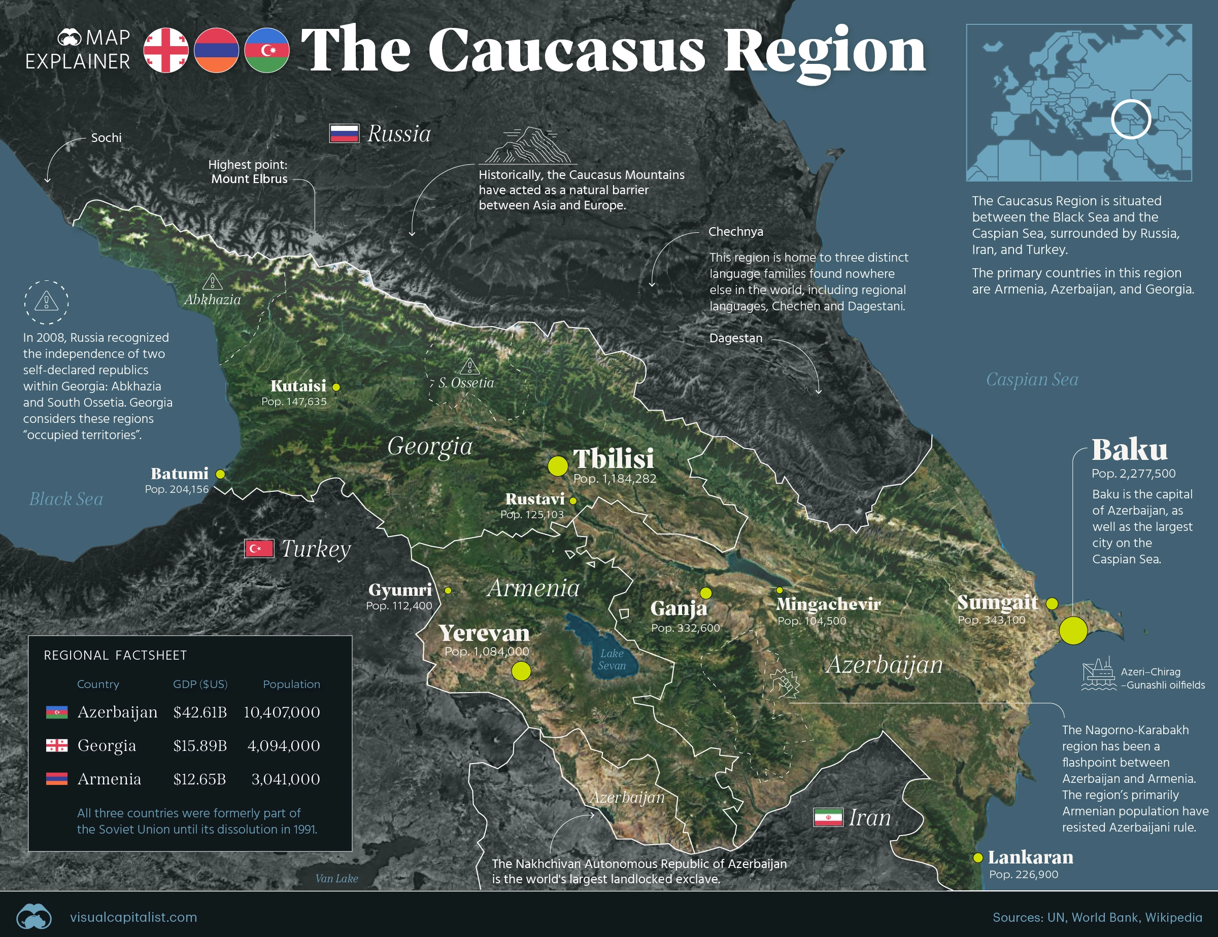 아제르바이잔은 국토 면적과 인구 면에서 이 지역에서 가장 큰 국가이다. 나고르노카라바흐 지역은 아제르바이잔의 공식 국경 내에 위치해 있으며 아르메니아 민족이 거의 거주하고 있다.
