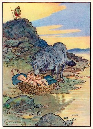 친절한 양치기 파우스탈루스는 로물루스와 레무스를 발견하고 그들을 집으로 데려와서, 그와 그의 아내는 그들을 자신들의 자식으로 키운다. 이 아이들은 원래 테베레 강에 버려져 암늑대의 보살핌을 받았다.