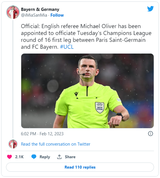 불행하게도, 그것은 다시 일어나고 있다. UEFA는 이번 주 화요일(한국시간 기준 15일(수) 새벽 5시)에 열리는 바이에른 뮌헨과 파리 생제르맹의 경기에 마이클 올리버 잉글랜드 심판을 임명했다고 발표했다. 답글의 반응은 모든 것을 말해준다 - 팬들은 이 결정에 낙담하고 있다.