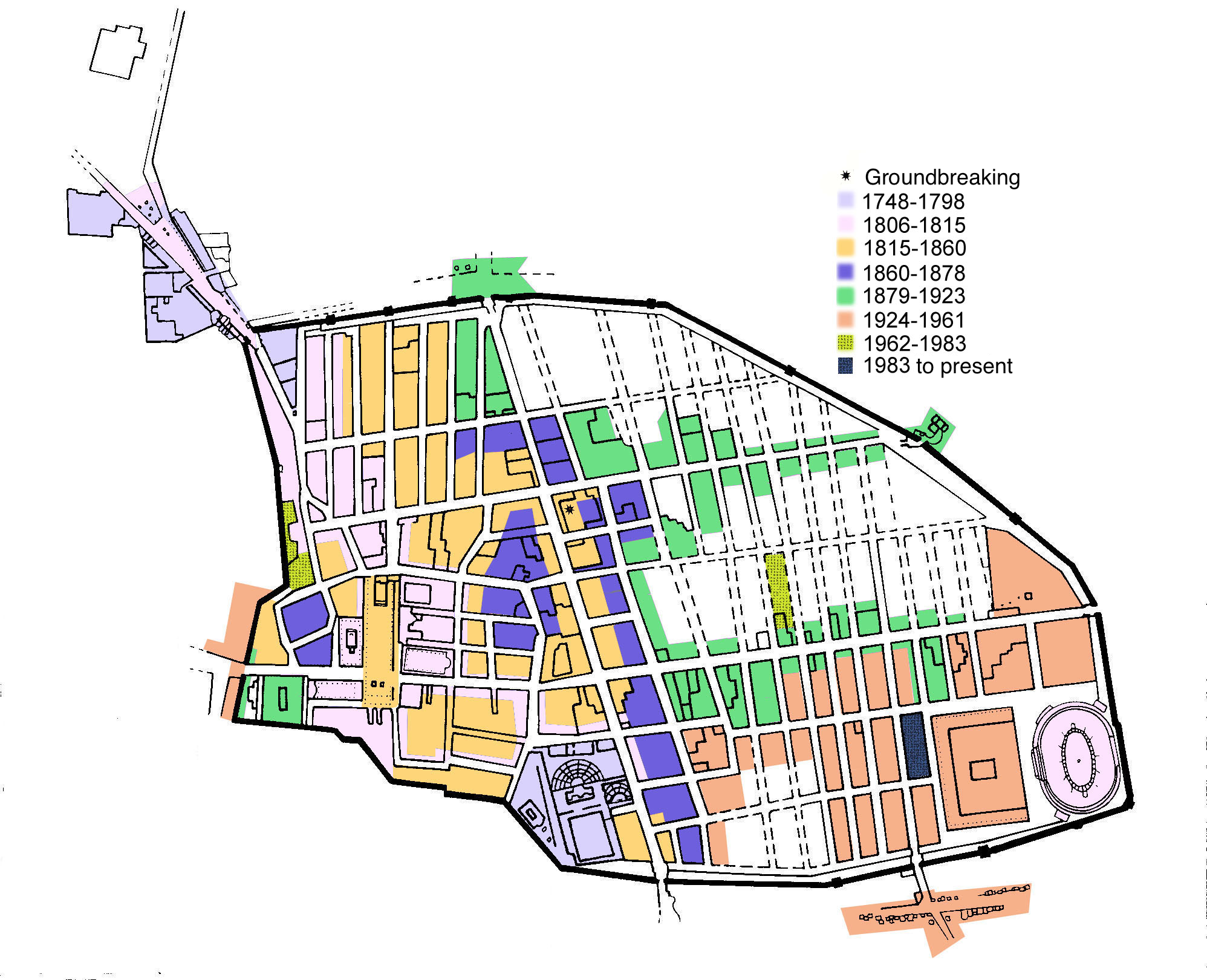 폼페이 유적은 1599년에 처음 발견되었지만 유적에 대한 관심이 줄어들기 전에 발견된 유물은 몇 개뿐이다. 발굴은 1748년에 두 번째로 발굴된 이후 본격적으로 시작되어 현재까지 이어지고 있다. 이 지도는 고고학자들의 진행 상황을 보여준다. 당국의 규제로 인해 마을의 일부 지역은 아직 탐험되지 않았다. 고고학 팀 외에도 매년 수백만명의 관광객이 이 유적을 방문한다.