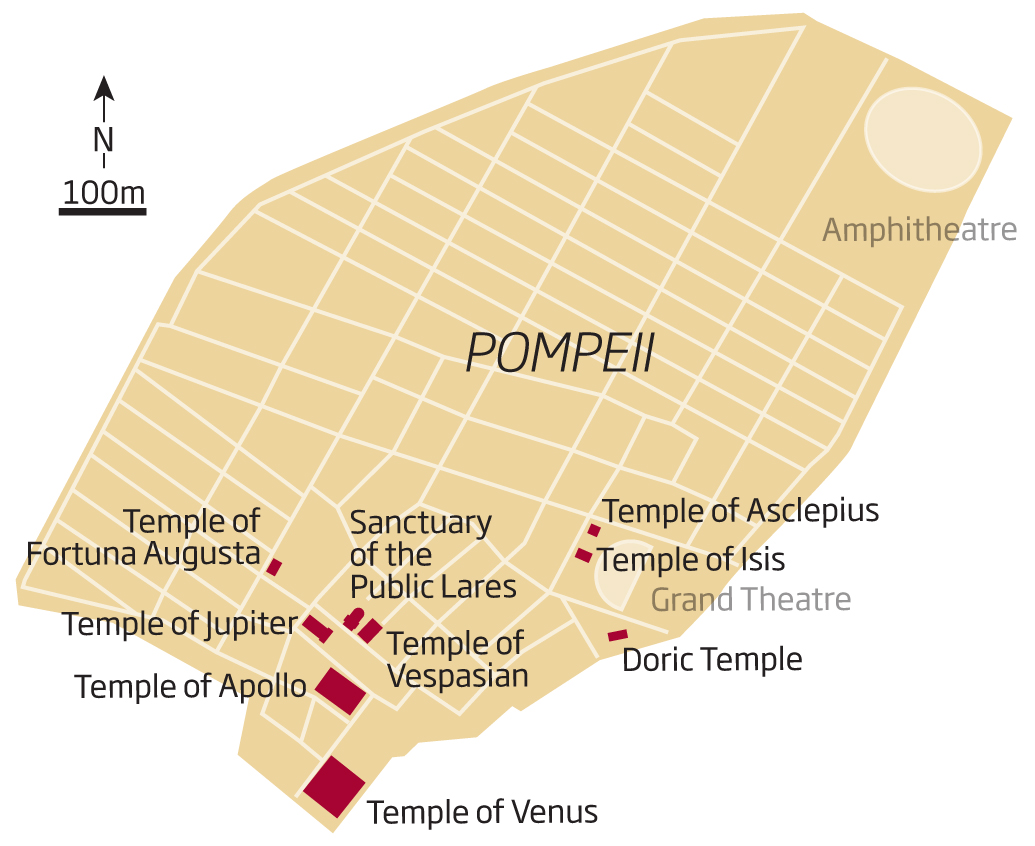 대부분의 역사에서 로마는 다신교 사회였다. 로마인들은 유피테르, 아폴로, 비너스를 포함한 로마와 그리스 신들의 판테온을 숭배했다. 공화국 초창기부터 로마인들은 신전을 짓고 신에게 제물을 바쳤으며 종교 지도자들과 상의하여 결혼식, 군사 공격 또는 기타 주요 사업을 위한 상서로운 날을 결정했다. 이 지도는 폼페이의 신전을 보여준다. 전통적인 다신교 신의 신전 외에도 지도에는 베스파시아누스 신전이 표시되어 있다. 이것은 일부 역사가들이 베수비오 산이 폭발하여 도시를 파괴했을 때 권력을 잡은 황제를 기리기 위해 의도된 것으로 추측되는 미완성 구조이다. 종교와 국가는 로마 사회에서 밀접하게 얽혀 있었고 주체들은 통치자들을 반신의 인물로 생각하도록 장려되었다.