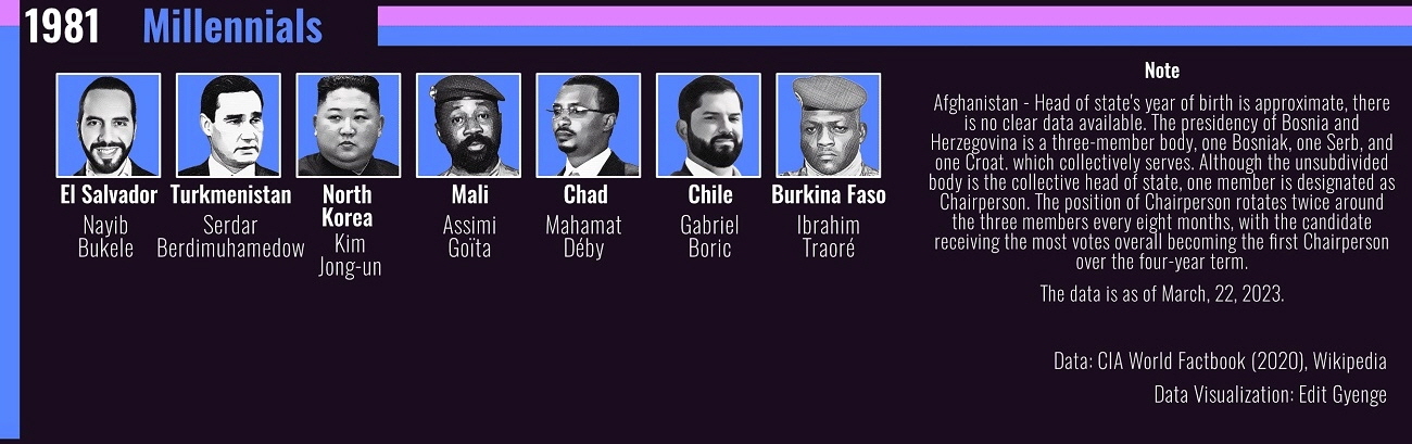 편집자 주: 이 시각화는 특히 국가 원수들을 대상으로 한다. 그 나라의 정부 시스템에 따라, 여기에 표시된 국가 원수들은 실제 정치적 힘을 가질 수도 있고 그렇지 않을 수도 있음을 언급해야 한다. 일부 국가에서 국가원수는 일상적인 통치에 영향을 미치지 않는 의례적인 입장일 수 있다.