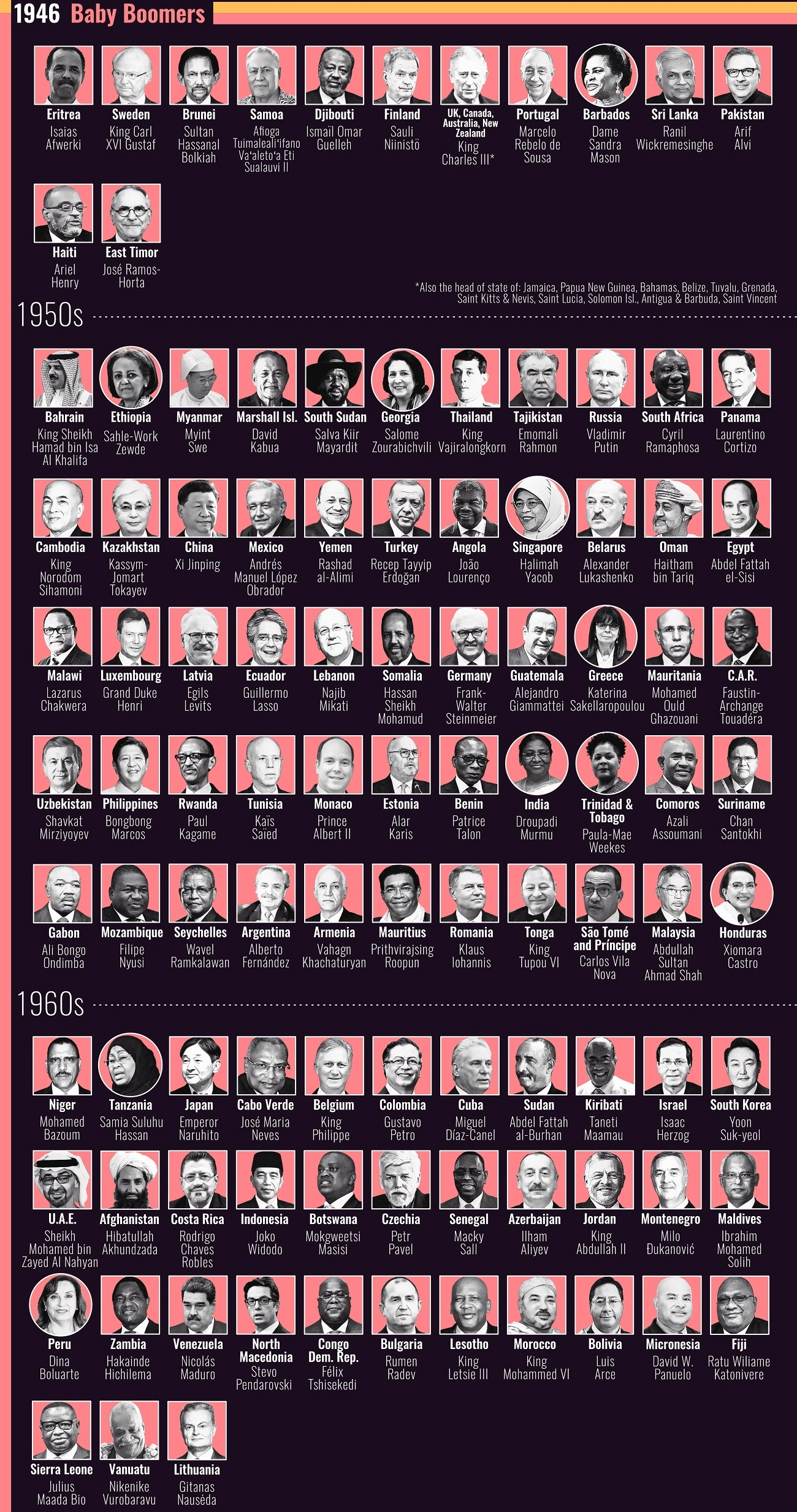 총 15개국의 국가원수인 영국의 찰스 3세를 포함하여 전 세계 국가원수의 58% 이상이 이 세대에 속한다.