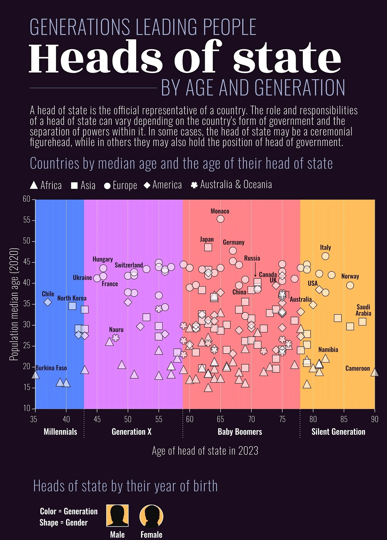 Edit Gyenge의 이 시각화는 2023년 3월 22일 기준 모든 국가원수의 나이를 해당 국가의 인구 중앙값과 비교한다. CIA 월드 팩트북과 위키피디아의 데이터를 사용한다.