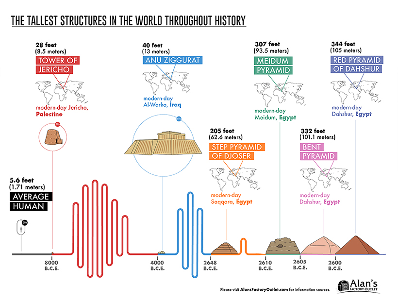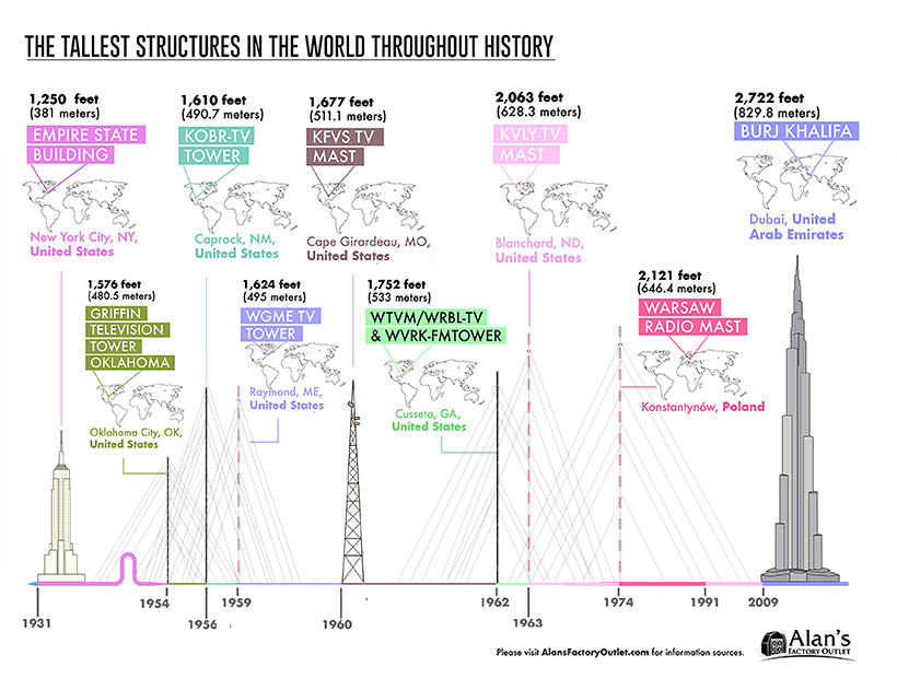Alan's Factory Outlet의 인포그래픽은 세계에서 가장 높은 구조물의 역사적 타임라인에서 가장 인상적인 건설 및 엔지니어링 업적 중 일부를 시각화한다.