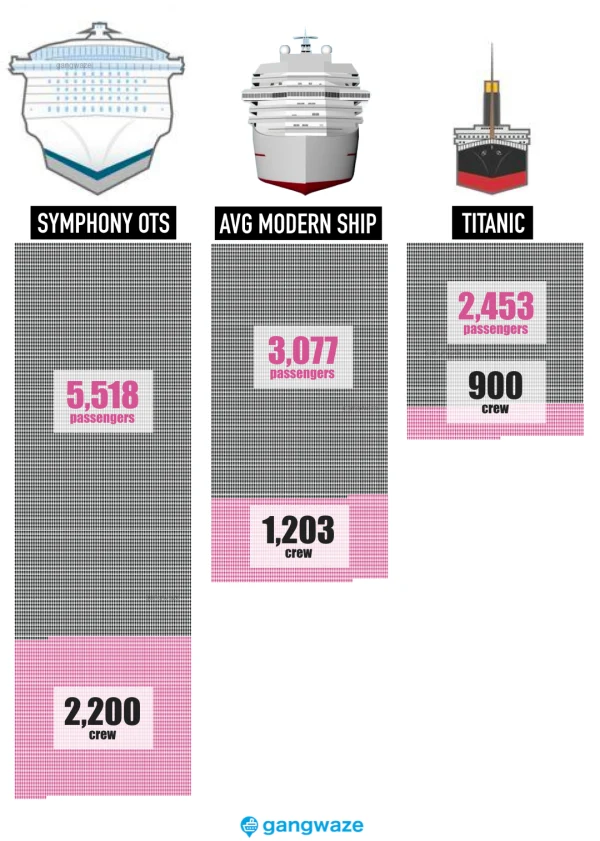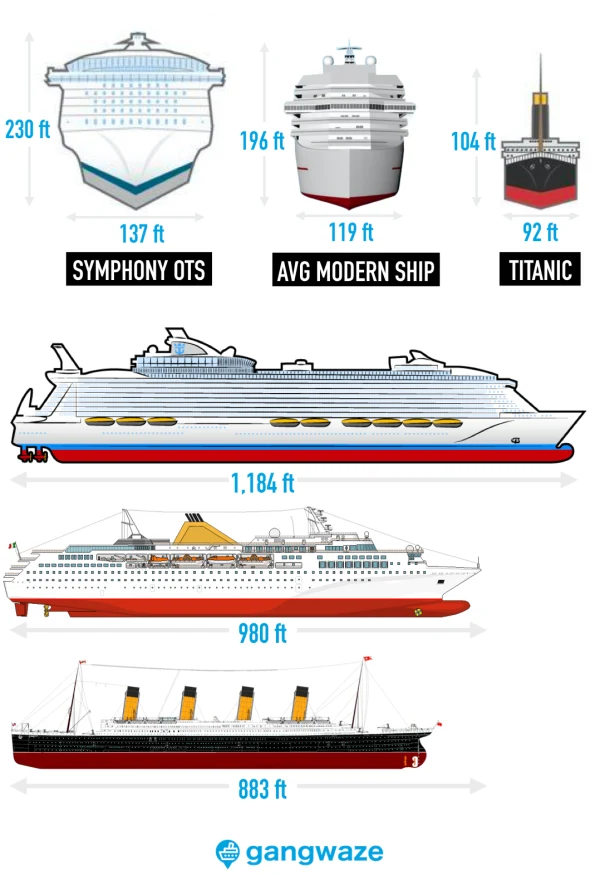 이제 각각의 주요 지표에서 타이타닉과 현대의 유람선을 비교해 보자. 더 많은 맥락에서, 우리는 또한 심포니 오브 더 시즈와 비교하여 그녀를 측정한다. 이 배는 현재 세계에서 가장 큰 유람선 중 하나이다.