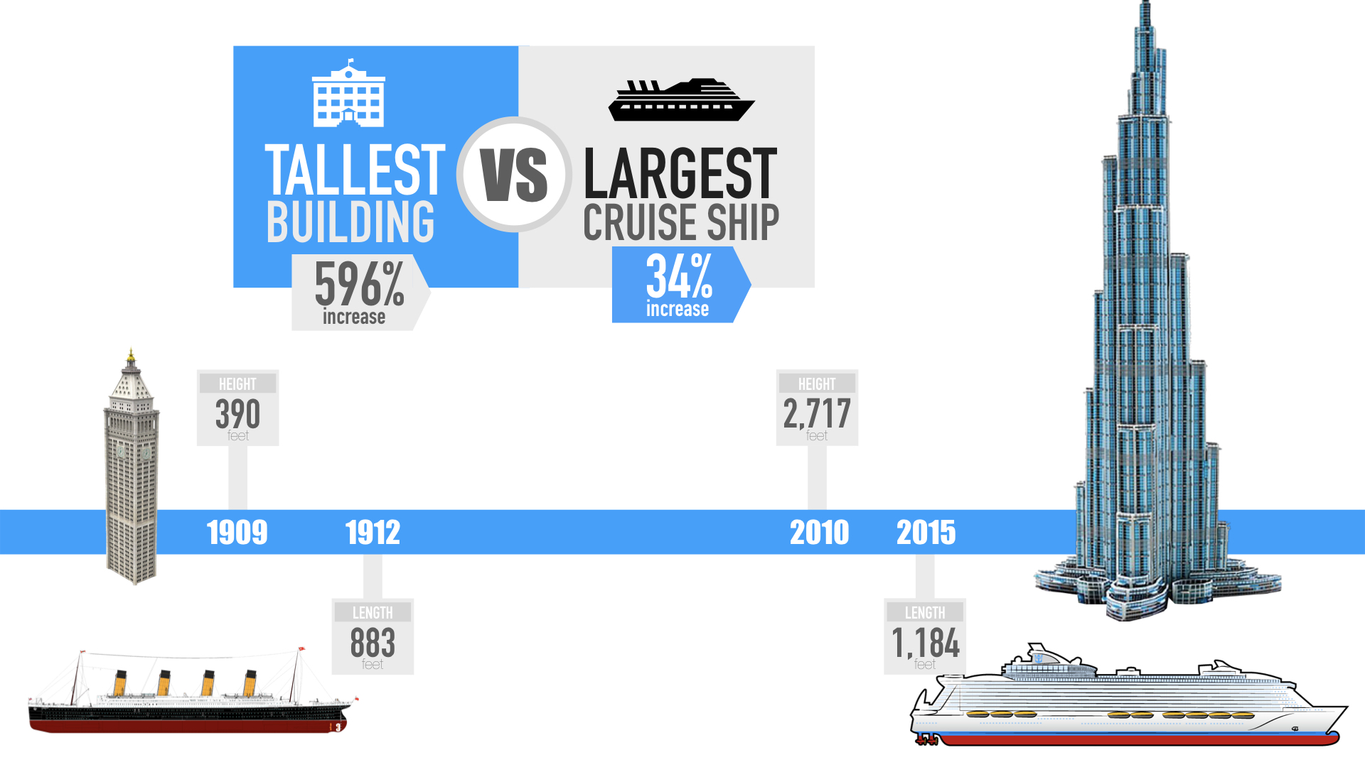 위의 차트를 보면 빌딩 크기가 유람선 크기보다 훨씬 빠르게 성장했음을 알 수 있다. 1912년에 가장 높은 빌딩은 390피트였다. 오늘날은 2,717피트이다! 타이타닉호의 길이가 883피트(269.1m)인 것과 현재 가장 큰 유람선 중 하나의 길이가 1,184피트(361m)인 것을 비교해 보라.