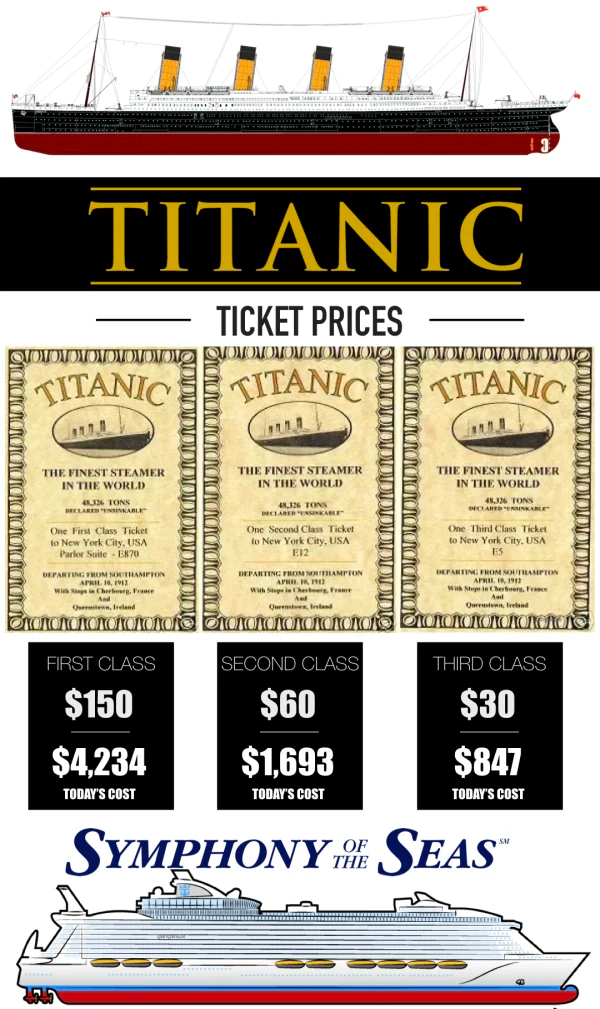 타이타닉의 티켓 가격은 얼마였을까? 타이타닉은 세 종류의 선실을 가지고 있었다. 1등실, 2등실, 3등실. 각각의 비용은 놀랍게도 오늘날의 크루즈 비용과 일치했다.