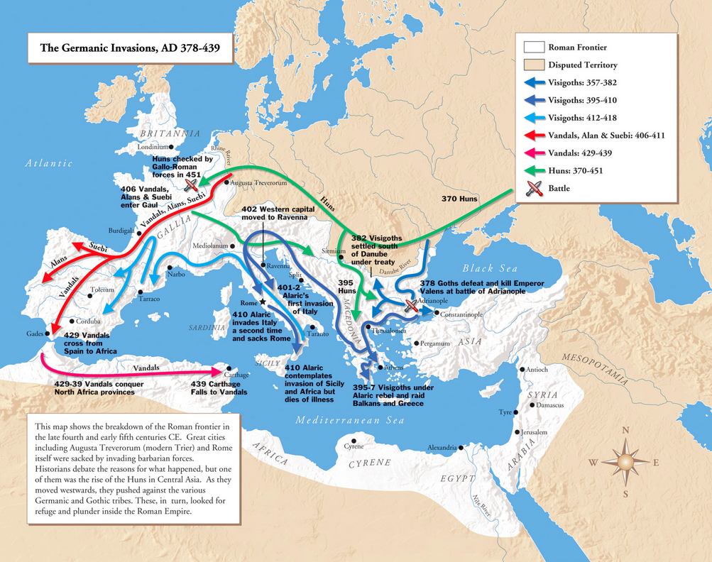 이 지도는 수십 년 전에 존재했던 서로마 제국의 지도와 크게 다르다. 하지만 변화의 정도를 과장하지 않는 것이 중요하다. 서유럽은 1세기 전과 마찬가지로 526년에 거의 동일한 민족 집단으로 구성되었다. 마지막으로 붕괴되기 오래전, 인력 부족으로 제국은 야만인을 군단에 편입시켰다. 그래서 옛 제국을 조각낸 야만인 부족들, 즉 프랑크, 서고트, 동고트, 반달 등은 수세기 전에 로마를 위협했던 부족들보다 훨씬 더 로마화 되었다. 이 새로운 왕국의 통치자들은 일반적으로 구 서로마 제국 전역에서 여전히 상당한 부와 권력을 보유하고 있는 로마 엘리트를 선택하려고 했다. 따라서 로마인들은 갑자기 외부인에 의해 통치되는 것에 어리둥절해했지만 526년의 서유럽은 426년과 크게 다르지 않았다.