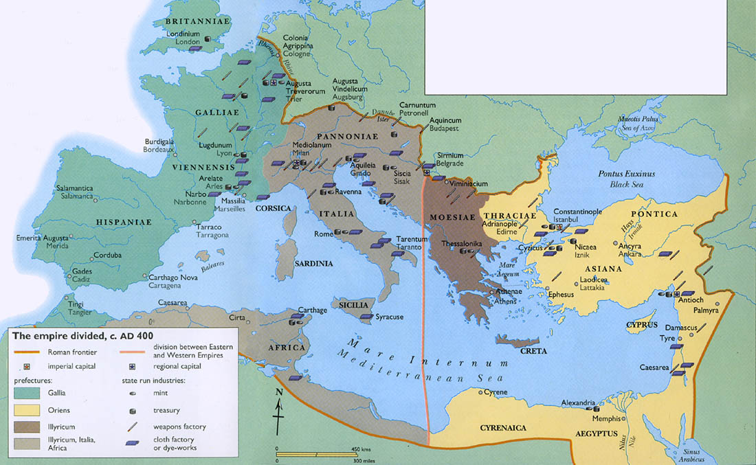 콘스탄티누스는 통합된 로마 제국을 통치했지만 이것은 점점 더 드물게 되었다. 337년 콘스탄티누스가 사망하자 제국은 그의 세 아들은 분열되어 빠르게 싸우기 시작했다. 이 악순환은 다음 반세기 동안 여러 번 반복되었다. 한 사람이 통치하기에는 제국이 너무 크다는 것이 분명해졌다. 통합 제국을 통치한 마지막 황제 테오도시우스는 395년에 사망했다. 이 지도는 그 결과를 보여주며 제국이 동서로 완전히 분할되었다. 제국이 통치하기에 너무 커진 이유는 무엇일까? 제국은 3세기의 정치적 위기나 250년에 시작되어 수백만명의 사람들을 죽인 전염병으로부터 완전히 회복되지 않았으며 로마의 경제는 큰 타격을 받았다. 400년이 되자 한 명의 황제가 스페인에서 중동까지 뻗어있는 영토를 보호할 만큼 충분한 군대를 모집하는 것은 불가능했다.