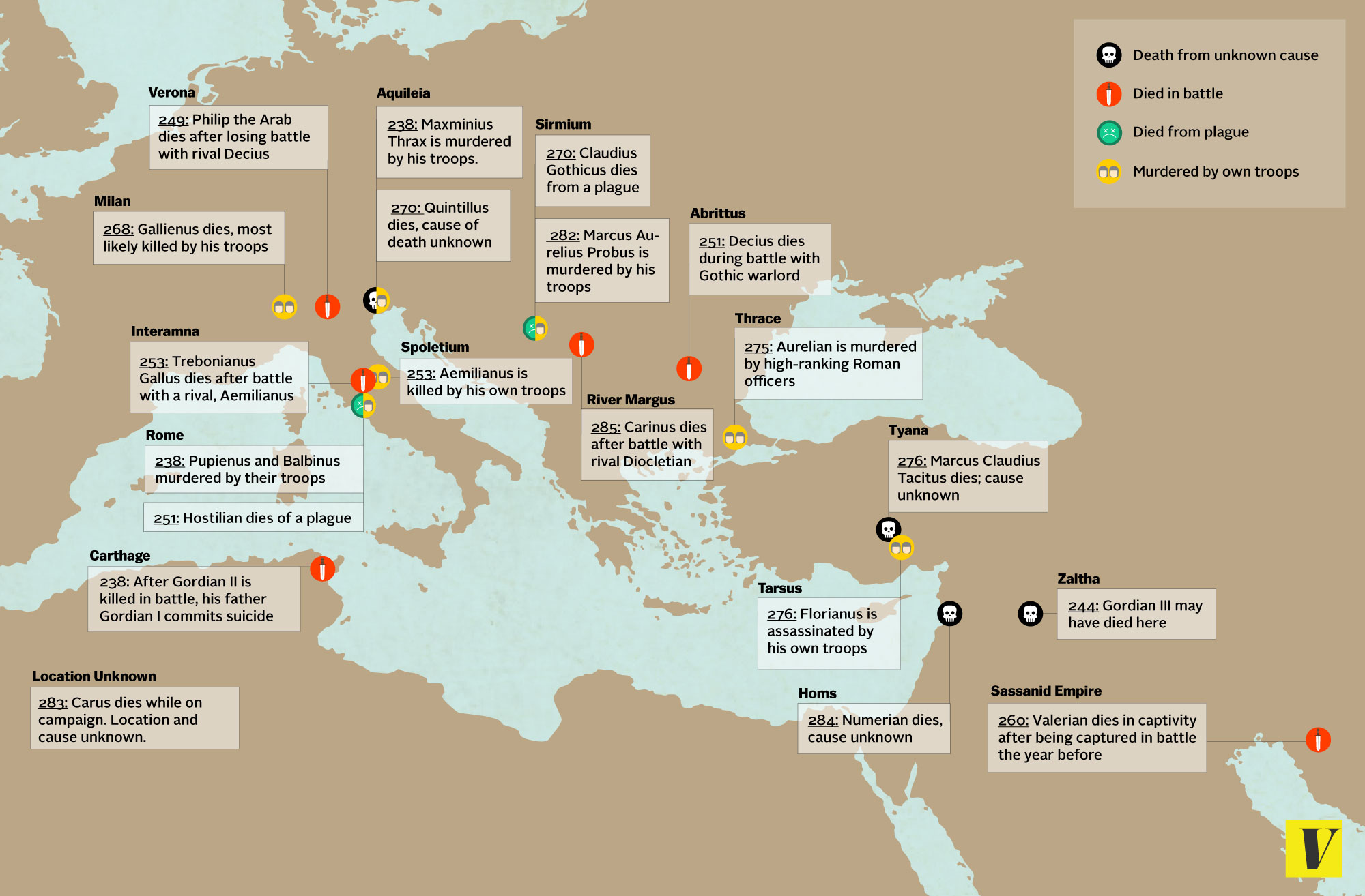 BC 27년 아우구스투스가 황제가 된 후 처음 2세기 동안 로마 제국은 전례 없는 정치적 안정과 경제적 번영을 경험했다. 그러나 상황은 AD 3세기에 급속도로 악화되었다. 235~285년 사이에 로마에는 20명 이상의 황제가 있었으며 이 지도에서 알 수 있듯이 대부분은 폭력적으로 사망했다. 일부는 자신의 군대에 의해 살해당했다. 다른 사람들은 왕좌에 대한 경쟁자들과의 내전에서 사망했다. 한 사람은 외국과의 전투에서 사망했으며 다른 하나는 전투에서 체포되어 포로로 죽었다. 이 유혈 사태가 제국의 해체로 이어졌다면 놀랄 일이 아니었을 것이다. 그러나 285년에 황제 디오클레티아누스가 권력을 장악하고 급락하던 제국을 위기에서 벗어나게 할 수 있었다. 20년의 통치 기간에 그는 (일시적으로) 유혈 사태의 악순환을 끝내고 제국이 400년대 후반까지 지속되도록 하는 개혁을 실시했다.