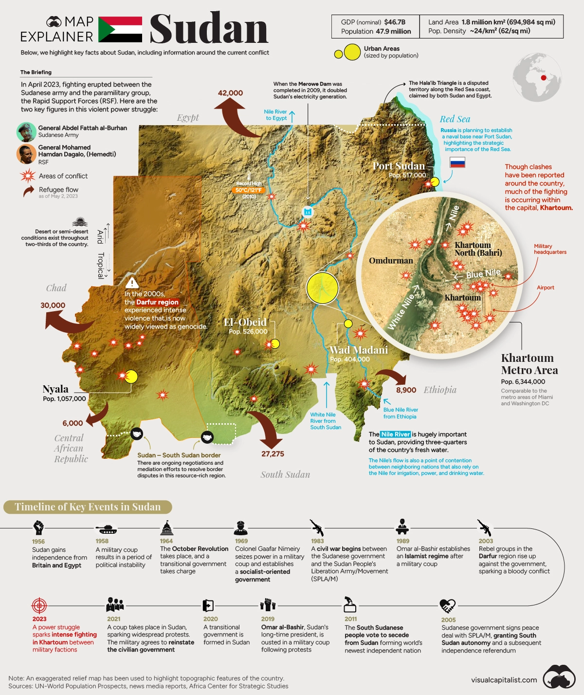 격렬한 전투가 나라를 뒤흔들면서 아프리카 국가인 수단이 헤드라인을 장식하고 있다. 이 피비린내 나는 권력 투쟁이 진행됨에 따라, 위의 지도 인포그래픽은 수단에 대한 일반적인 사실과 맥락뿐만 아니라 분쟁에 대한 핵심 정보를 제공하는 것을 목표로 한다.