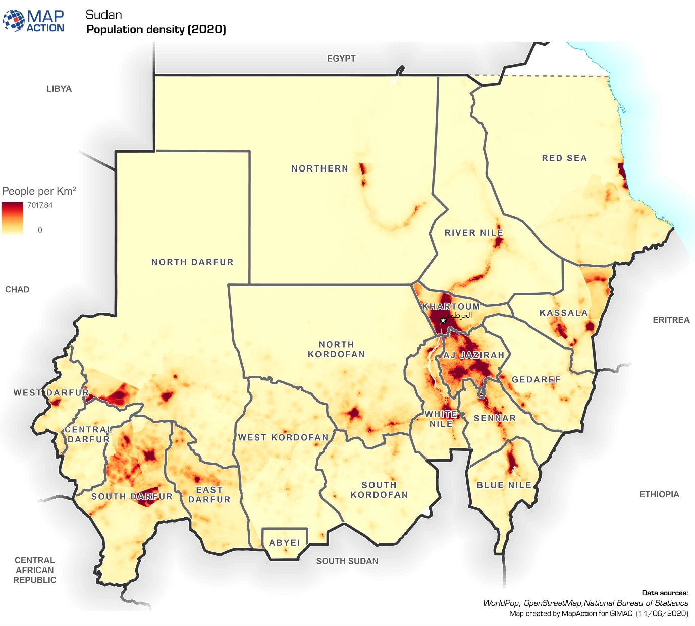 4천3백만 명 이상의 사람들이 수단에 살고 있으며, 아프리카에서 인구 기준으로 9위를 차지하고 있다. 아래에서, 우리는 수단 인구의 대부분이 두 개의 주요 지역에 집중되어 있는 반면, 국가의 대부분은 인구 밀도가 희박하다는 것을 알 수 있다.