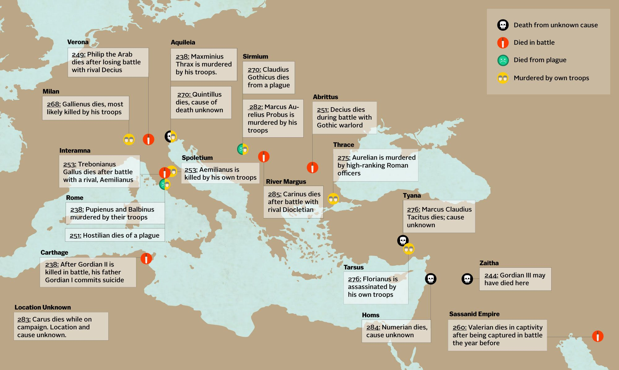 사망 : 284년 11월 에메사, 유럽으로 진군 중 사망, 아마도 질병, 살해되었을 가능성, 31세가량