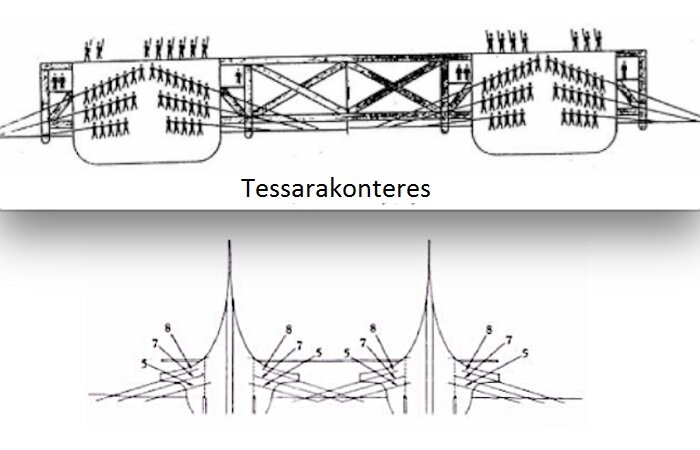 그러나 고대 자료에는 4,000명의 노 젓는 사람을 둔 프톨레마이오스의 테사라콘테레스가 언급되어 있다. 40단의 노 젓는 사람에 해당하는 이 용어를 해석하려는 시도는 여전히 과학자들 사이에서 의문을 제기한다.