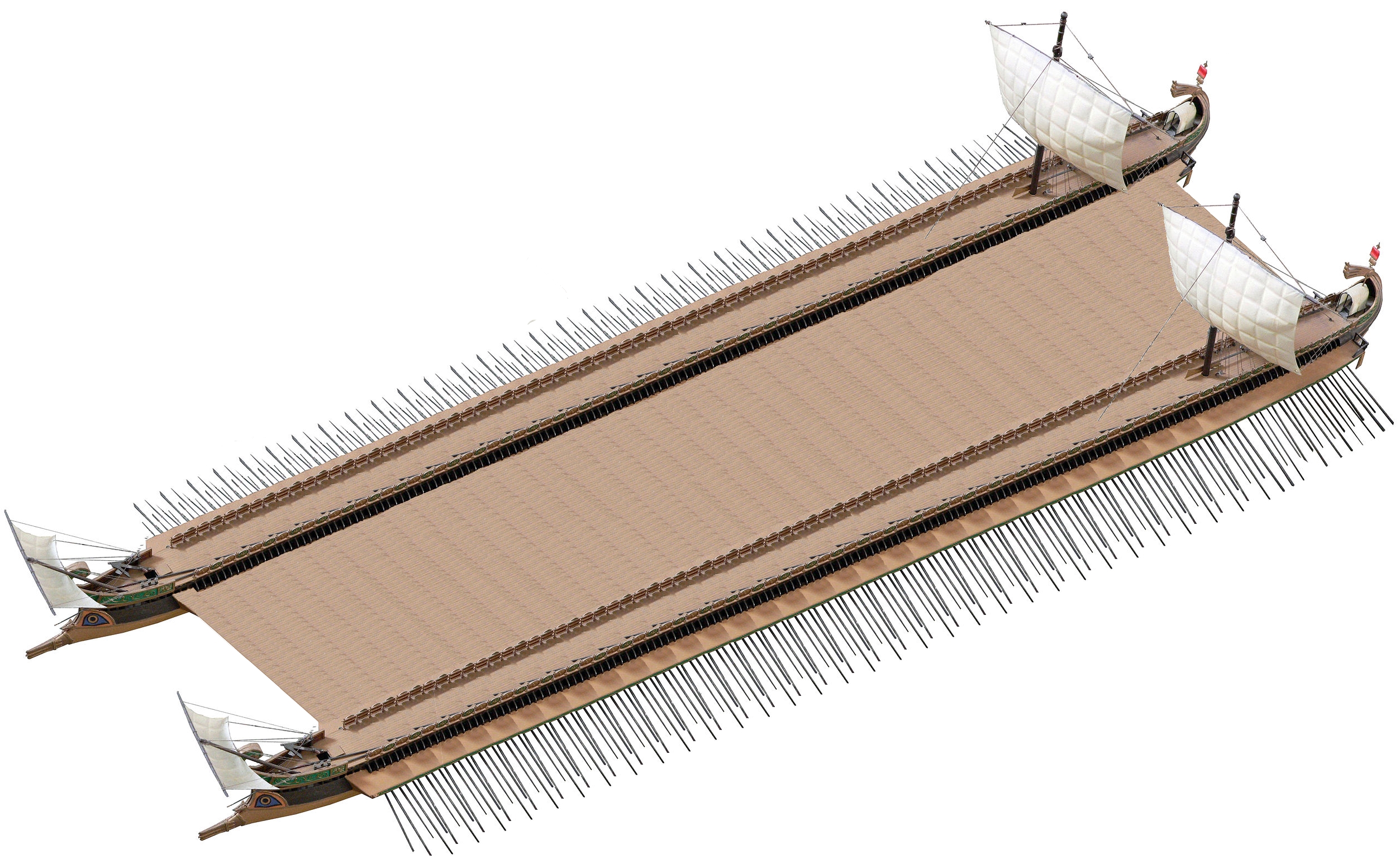 이런 케이스는 헬레니즘 시대에 있었다. 예 : 로마인이 시라쿠사를 포위하는 동안(BC 212) : 그들은 도시의 해안 성벽을 점령하기 위해 공통 갑판에 "Helepolis"(타워형 공성 구조물)를 배치하기 위해 같은 방식으로 Penteres(5단)를 연결했다.