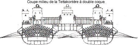이 거대한 배의 노를 젓는 사람의 분포에 대한 다양한 설명이 있지만 가장 중요한 것은 L. 캐슨이 주장한 쌍동선 유형의 배라고 가정한 것이다. 그의 의견에 따르면 테사라콘테레스(40단)는 실제로 공통 갑판으로 단단히 연결된 두 개의 Eikoseres(20단)로 구성되었다.