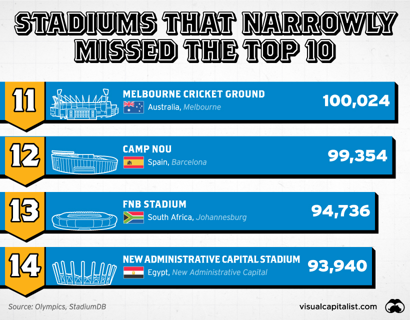 단 세 개 나라가 상위 10위 안에 포함되어 있지만, 조금만 더 아래를 보면 지리적으로 다양한 국가들이 있다. 아래는 세계에서 11번째에서 14번째로 큰 경기장들이다.