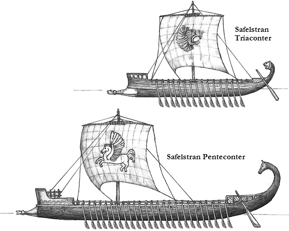 다음 발전형은 비레메와 길이는 같지만 층을 추가하여 높이를 올린 트리레메이며 노 젓는 사람이 180으로 증가했다. 또한 큰 사각형 돛을 가졌다.