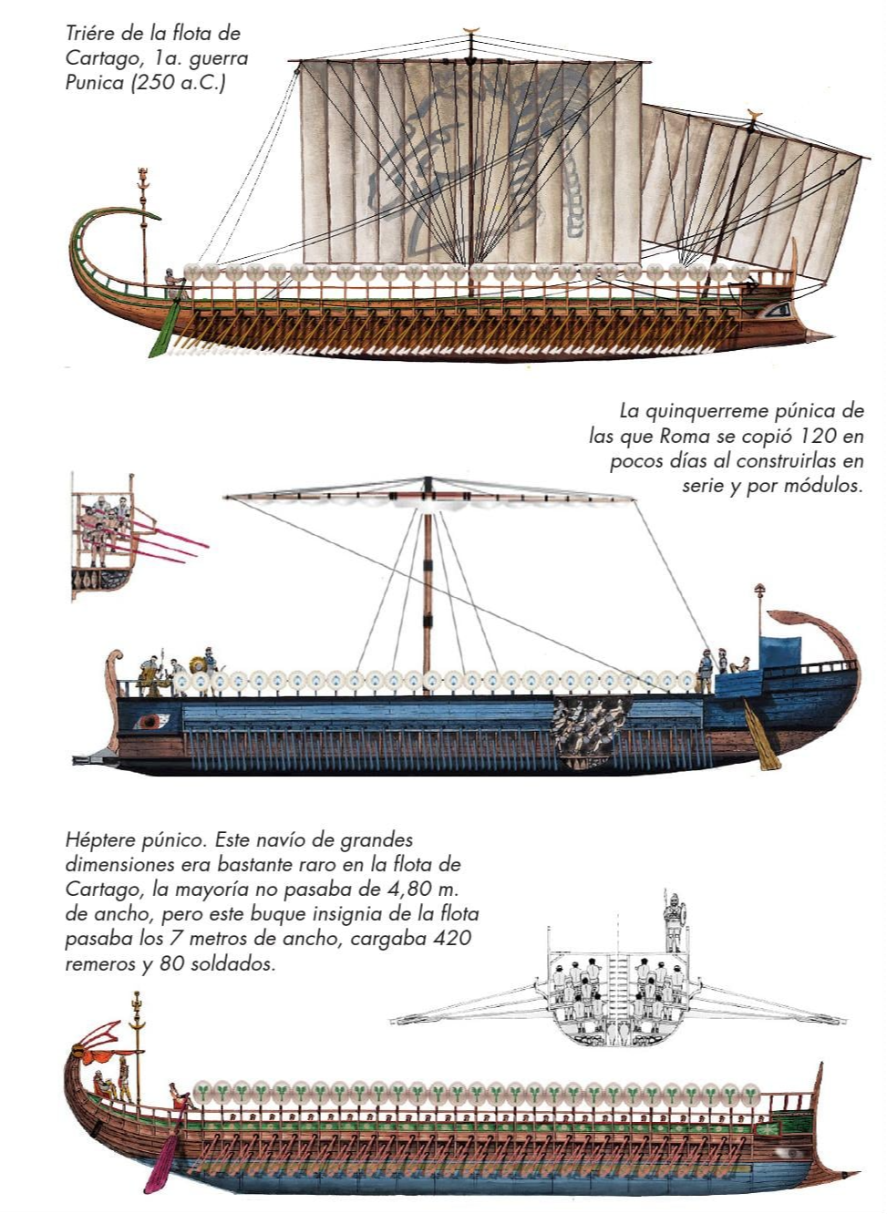 · 카르타고 헵테레스(라틴어 셉티레미스). 카르타고 함대는 대부분 함선의 폭이 4.8미터였지만 보기 드문 이 대형 함선은 폭이 7미터가 넘는 함대의 기함으로 420명의 노 젓는 사람과 80명의 해병이 탑승했다.