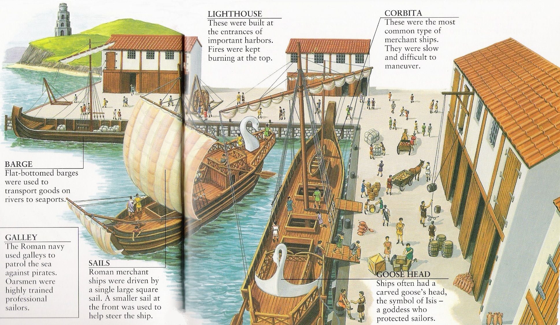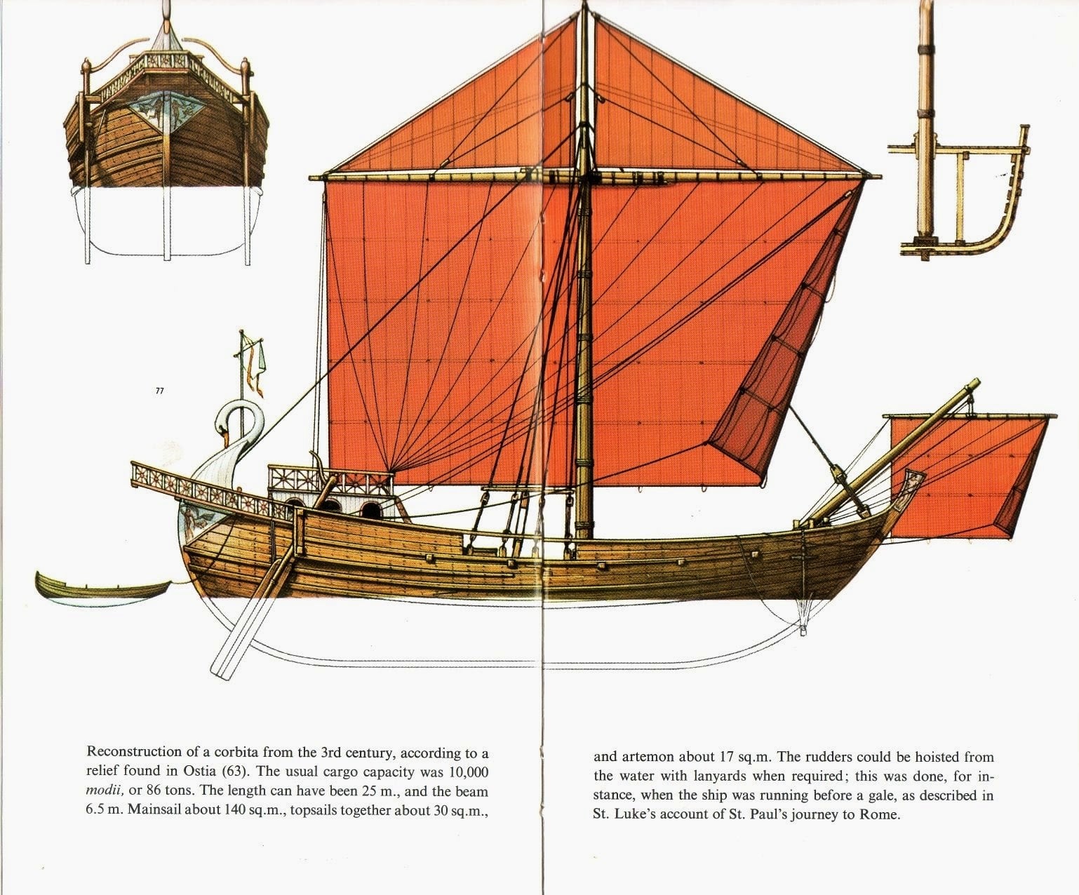· 돛 : 로마 상선은 하나의 큰 사각형 돛으로 움직였다. 앞쪽의 작은 돛은 배를 조종하는 데 사용되었다.