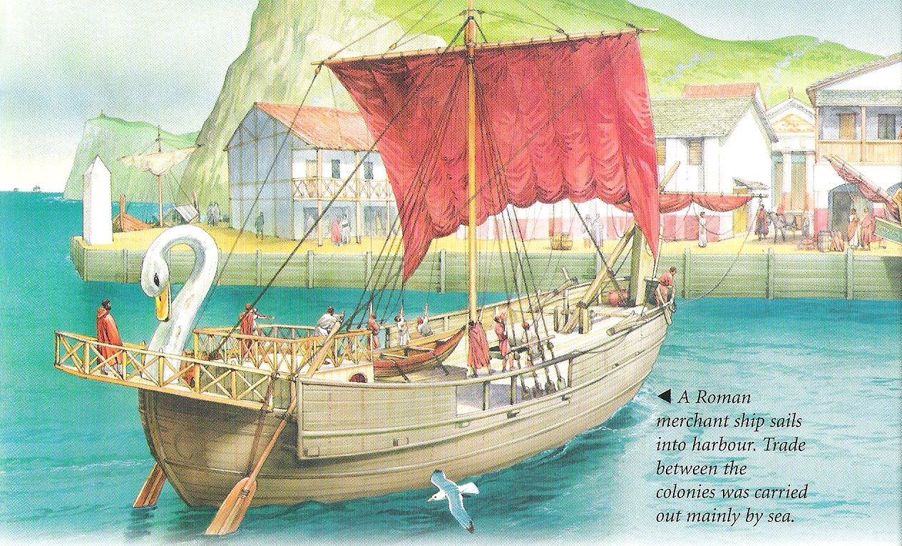 로마 상선이 항구로 입항하고 있다. 콜로니아 간의 무역은 주로 해상을 통해 이루어졌다.