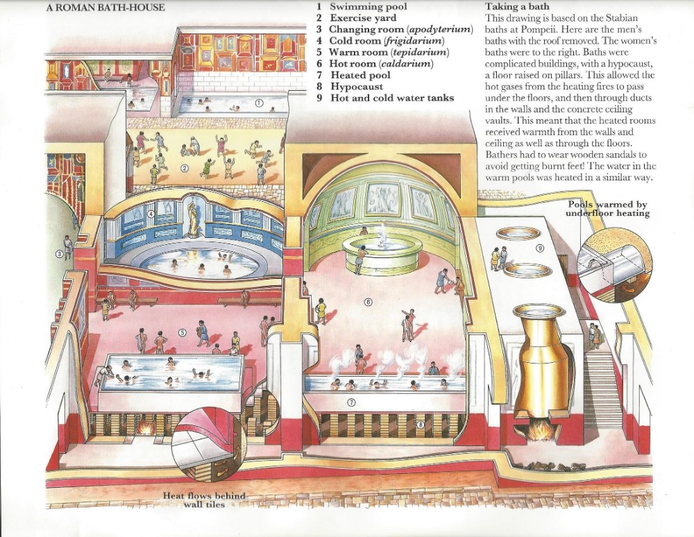 이 그림은 폼페이의 스타비안 목욕탕을 기반으로 한 지붕을 절단한 남자 목욕탕의 단면도이다. 목욕탕은 복잡한 건물이었고, 기둥 위에 바닥을 깐 온돌 방식이다. 불을 지펴서 나오는 뜨거운 열기가 바닥 밑을 통과하게 했고, 그러나 나서 벽의 관과 콘크리트로 된 아치형 천장을 통과하게 했다. 이는 데워진 방들이 바닥뿐만 아니라 벽과 천장으로부터 온기를 받는 것을 의미했다. 목욕하는 사람들은 발에 화상을 입지 않도록 나무 샌들을 신어야 했다! 온탕의 물은 비슷한 방법으로 가열되었다.