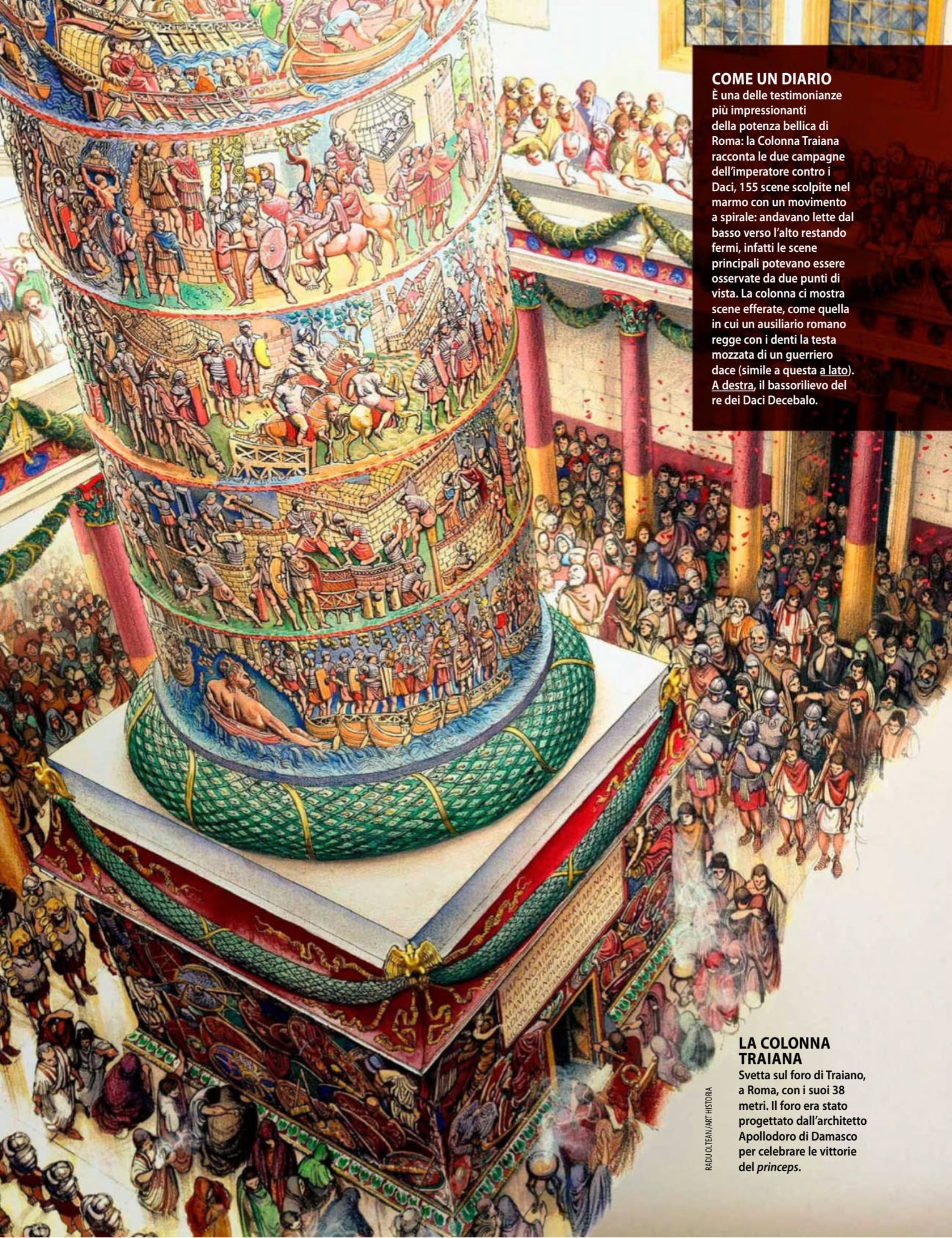 로마 군사력에 대한 가장 인상적인 증언 중 하나이다. 트라야누스 원기둥은 나선형으로 대리석에 새겨진 155개 장면을 통해 다키아인에 대한 두 번의 캠페인을 알려준다. 가만히 서서 아래에서 위로 읽었고 실제로 주요 장면은 두 시점에서 관찰할 수 있었다.