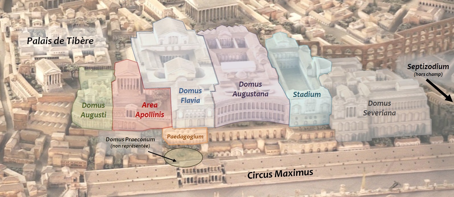 왼쪽 뒤로 2대 황제 티베리우스의 궁전이 있고, 전면에는 초대 황제 아우구스투스가 거주한 도무스 아우구스티와 아우구스투스가 지은 아폴로 신전을 비롯한 신전들이 있는 구역이 있으며, 가운데에는 11대 황제 도미티아누스가 지은 도무스 플라비아(공적 공간), 도무스 아우구스타나(사적 공간), 스타디움이 있다. 도무스 세베리아나는 20대 황제 셉티미우스 세베루스가 지은 언덕의 마지막 궁전이다. 바로 옆에 그가 세운 셉티조디움도 있다.